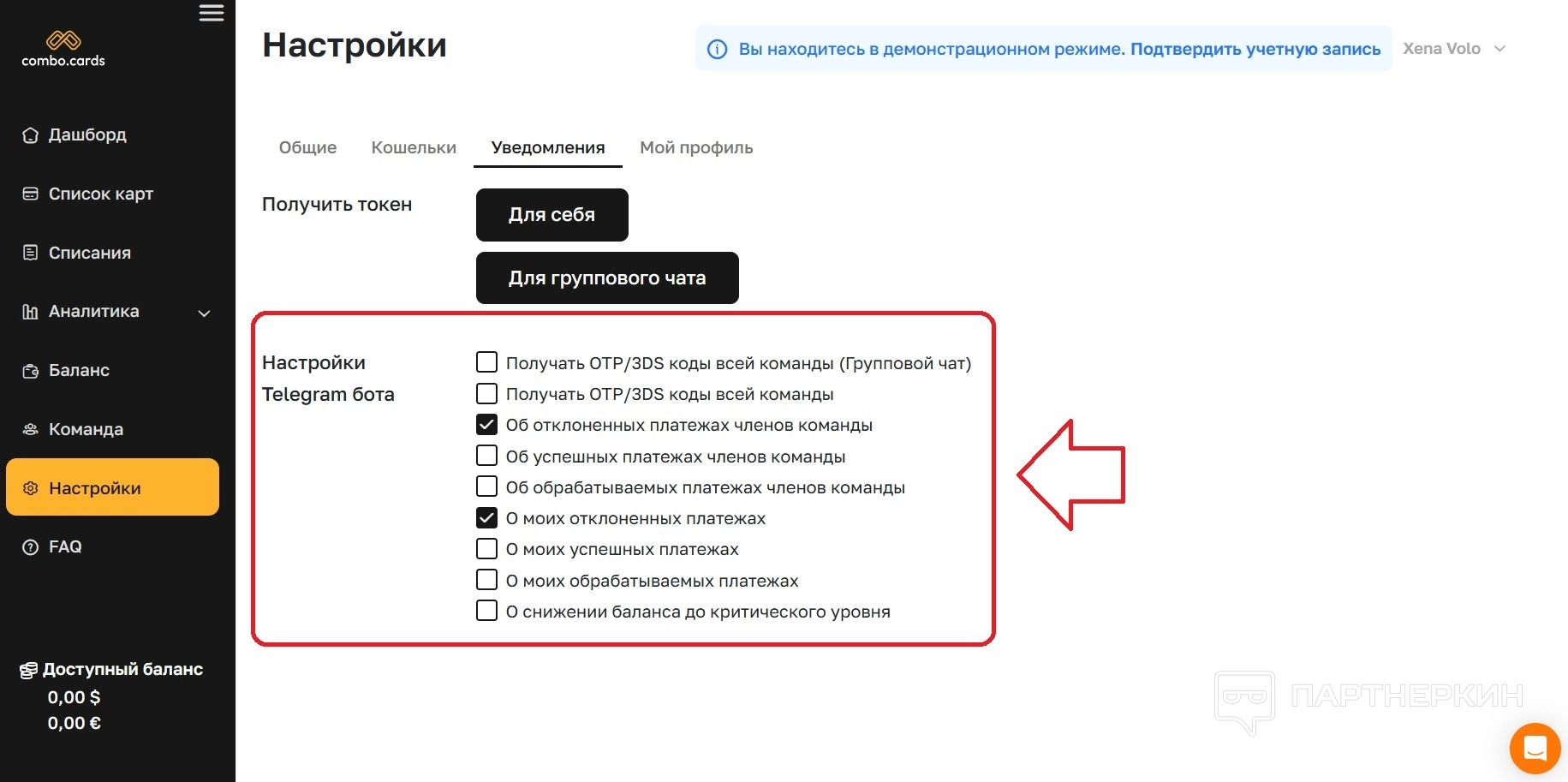 - зайти в свою учетную запись на Combo Cards, далее пройти в раздел Настройки — Уведомления — Сгенерировать;