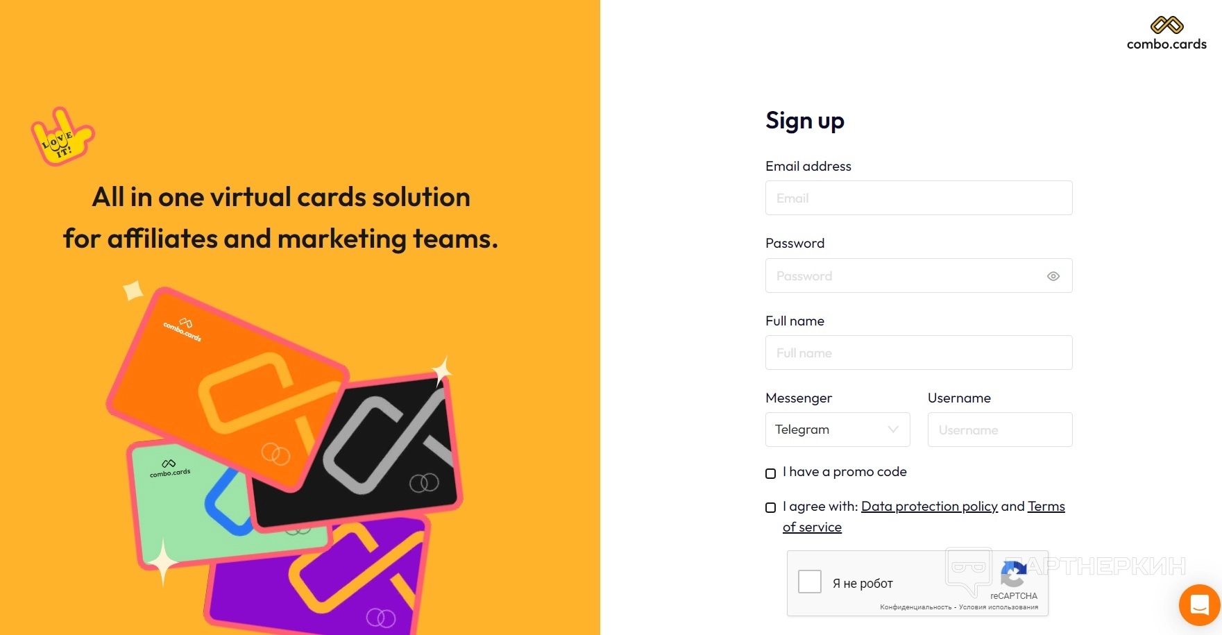 Чтобы воспользоваться услугами сервиса, необходимо зарегистрироваться на официальном сайте Combo Cards, указать минимум своих данных — почту, пароль, ФИО и контакт, например в Телеграм. Далее нужно подтвердить свой Email.