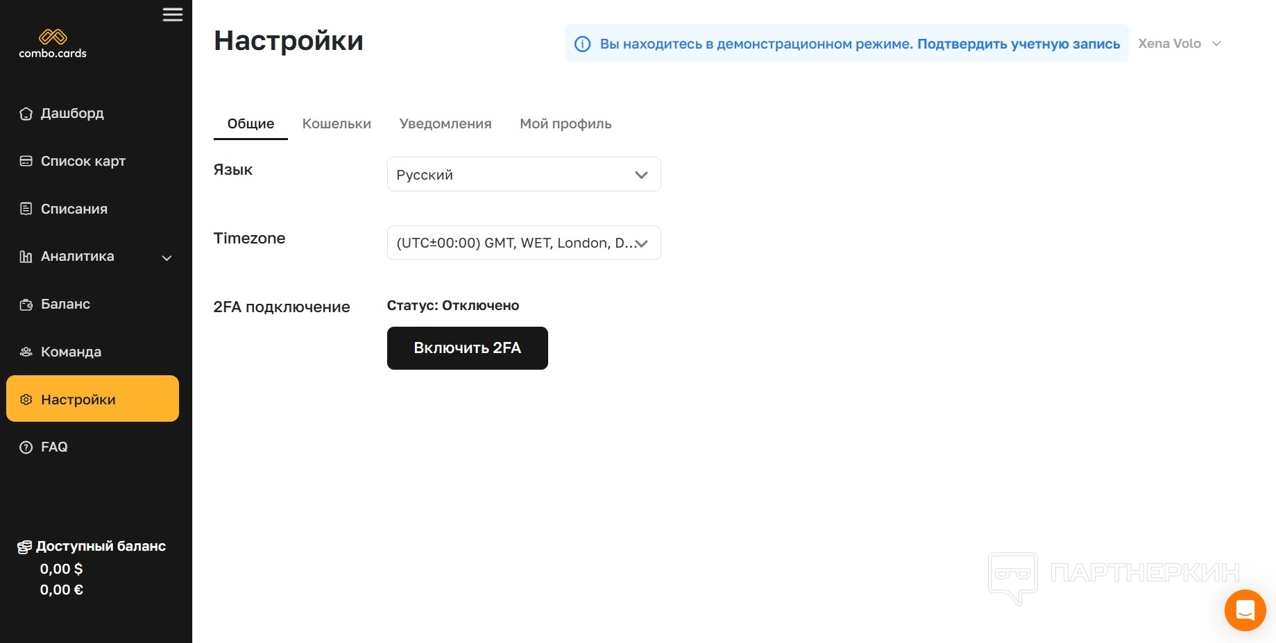 - Настройки . С помощью этого раздела можно настраивать язык, часовой пояс, подключать 2FA, добавлять кошельки TRC20 или ERC20, настраивать уведомления для себя или группового чата, активировать промокоды, загружать документы и личные данные для прохождения верификации.