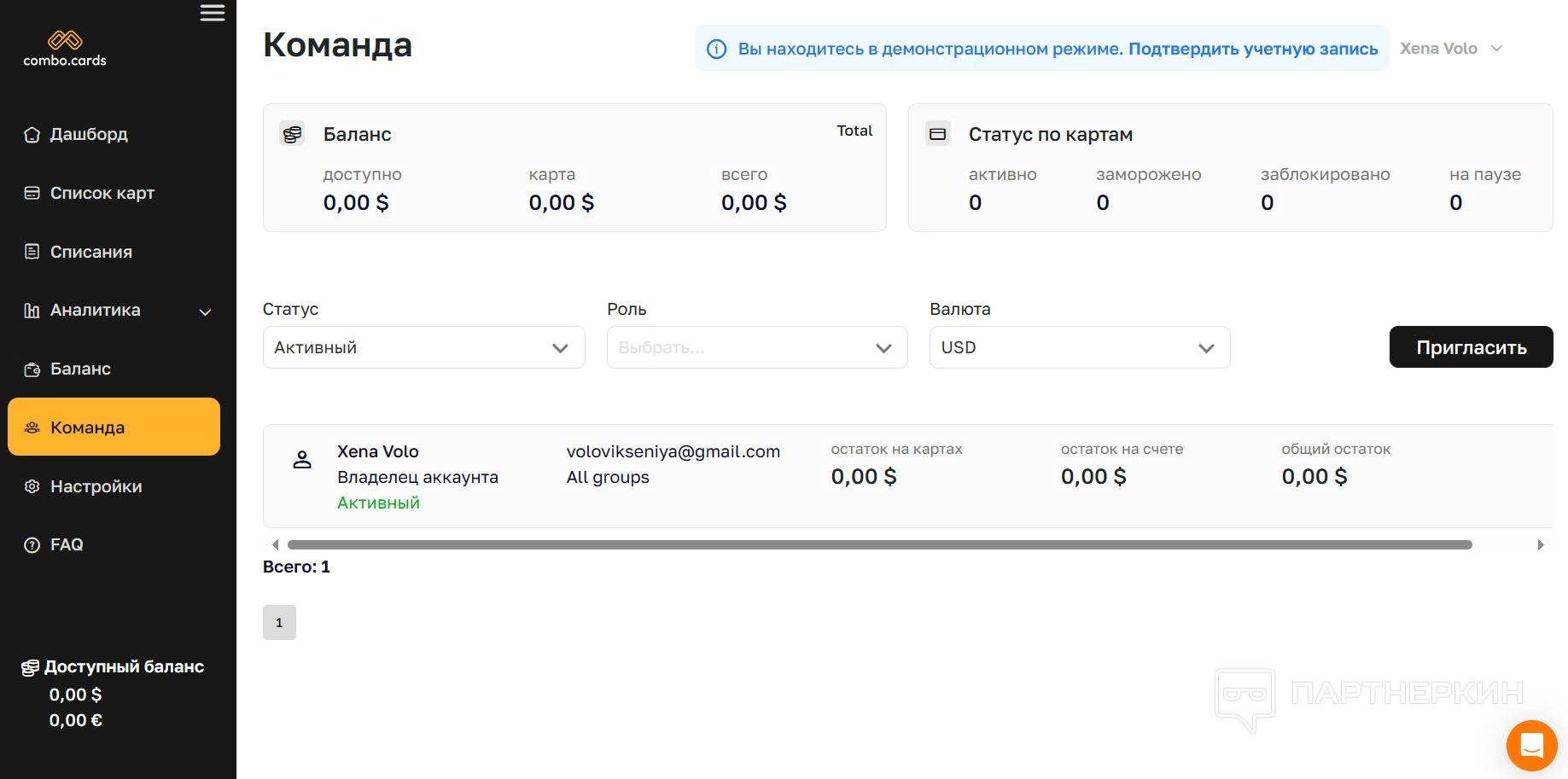 - Команда . Этот раздел позволяет приглашать новых членов команды, назначать им роли, смотреть информацию по картам, ролям, валютам.