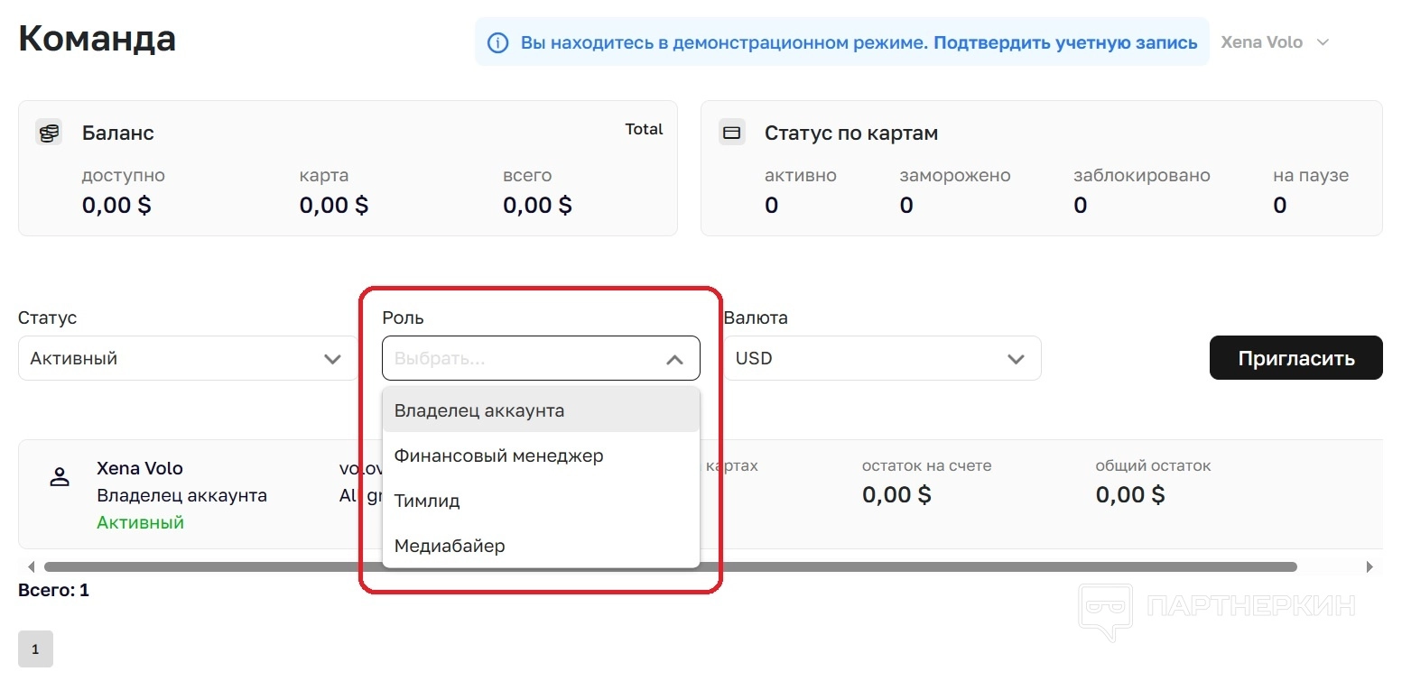 - Владелец : может выполнять любые действия в рабочем пространстве — пополнение баланса, создание карт, приглашение новых пользователей и управление их доступом, просмотр общей и индивидуальной статистики.