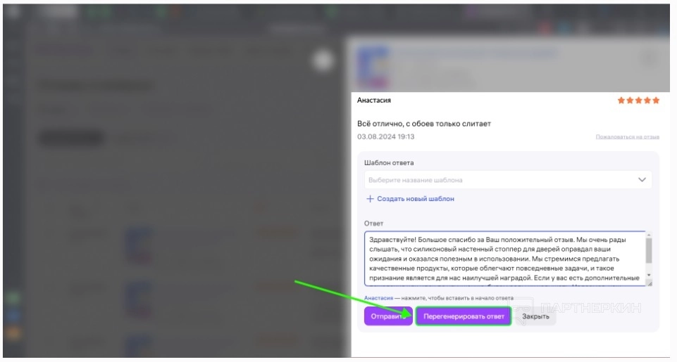 - Ответьте на отзыв : Кликните на кнопку «Ответить». В расширенном поле, которое появится, нажмите на «Сгенерировать ответ». Нейросеть автоматически создаст ответ на основе текста отзыва.