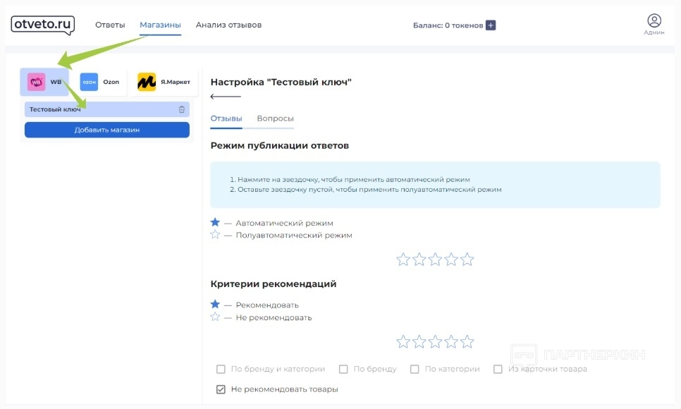 Шаг 1: Переход к настройкам . Для начала необходимо зайти в раздел «Магазины». Там отображаются все доступные маркетплейсы и подключенные магазины. После выбора нужного маркетплейса, следует выбрать конкретный магазин, что откроет меню настройки отзывов и вопросов.