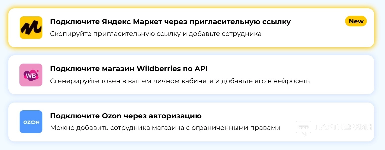 - Простое подключение к маркетплейсам . Для Ozon достаточно пройти авторизацию, а также есть возможность добавить сотрудника магазина с ограниченными правами, что обеспечивает безопасность и контроль доступа. Подключение к Яндекс Маркет осуществляется через пригласительную ссылку — пользователю нужно просто скопировать ссылку и добавить нового сотрудника. Что касается Wildberries, сервис предоставляет возможность интеграции через API, где необходимо сгенерировать токен в личном кабинете и добавить его в систему.