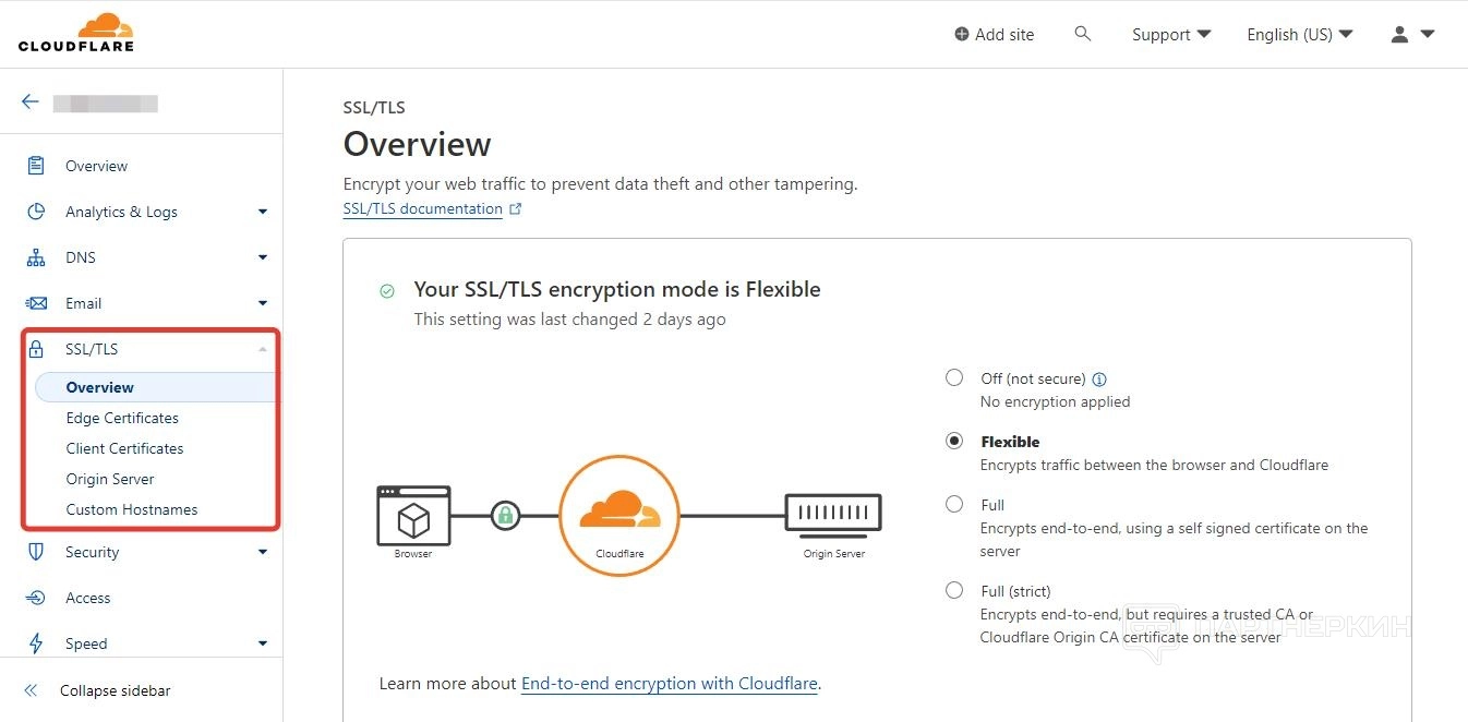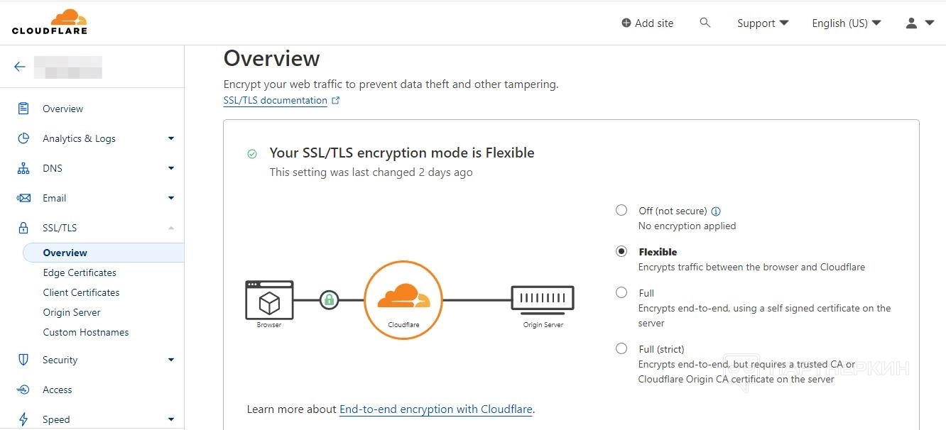 - full (strict) — сквозное шифрование,для которого требуется сертификат доверенного центра сертификации или Cloudflare Origin CA.