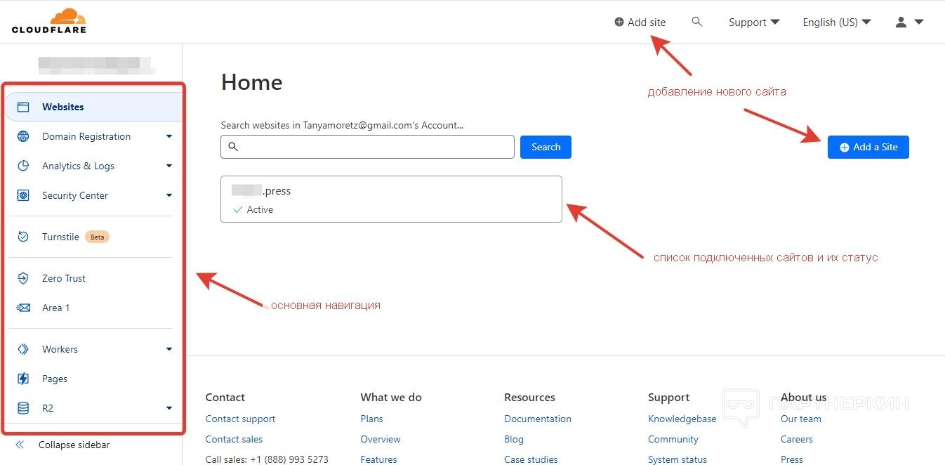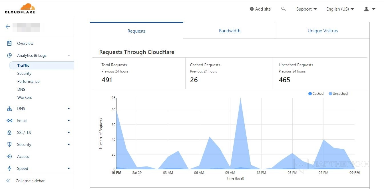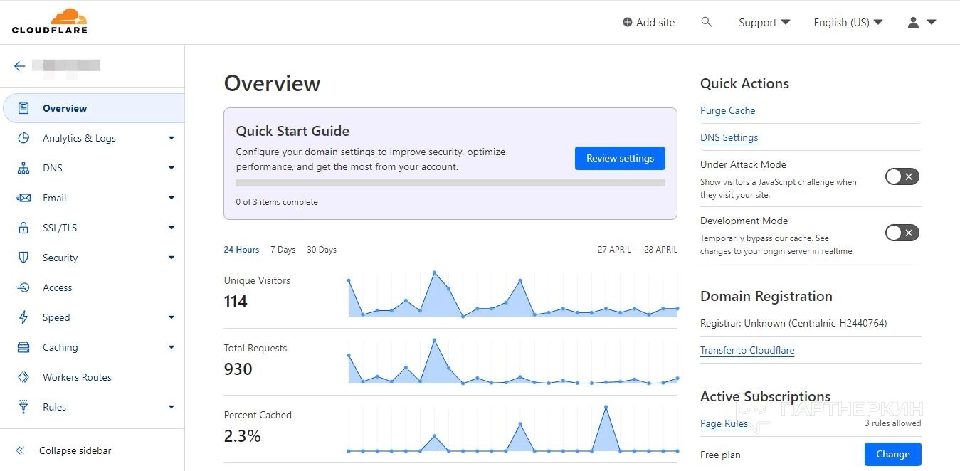 - Analytics & Logs. Аналитика веб-трафика, обзор предотвращенных атак, обзор производительности сайта, DNS-запросы.