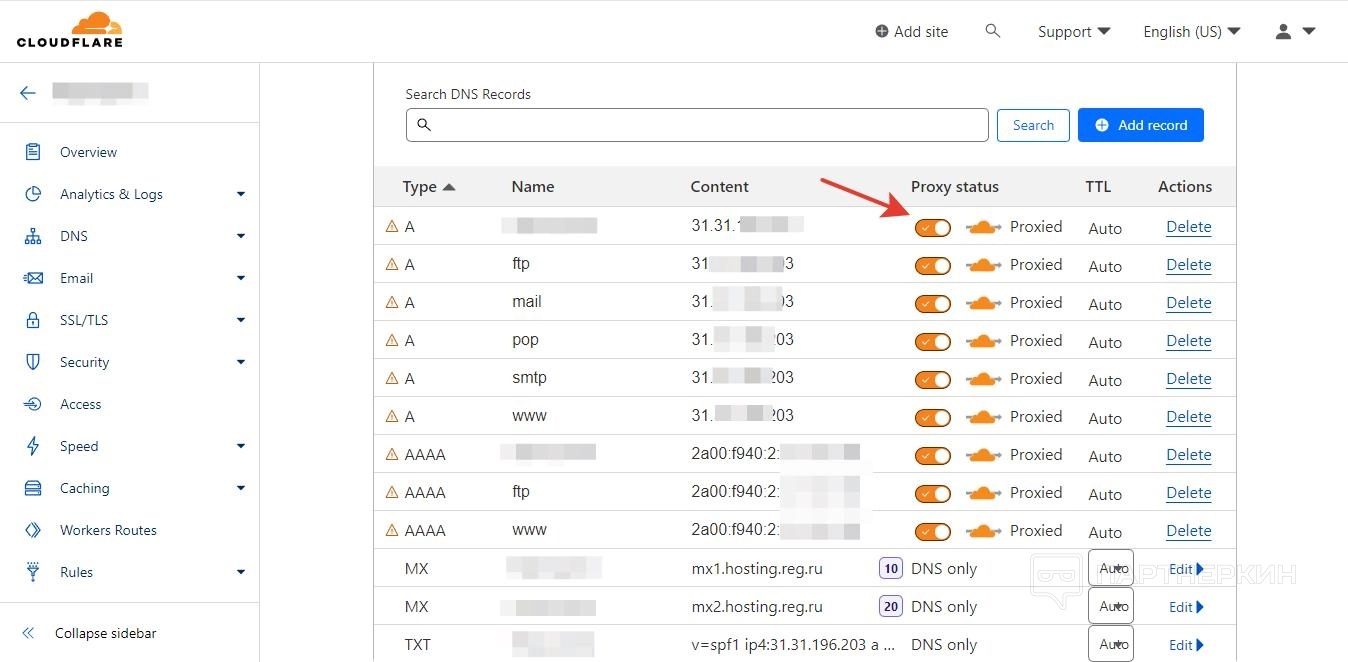 - Сервис проведет анализ домена и поиск DNS-записей для подключения веб-ресурса к их серверам. В результате должен выйти список адресов, подключенных к прокси. Если какой-то пункт отключен, его можно включить при помощи тумблера в столбце Proxy status.