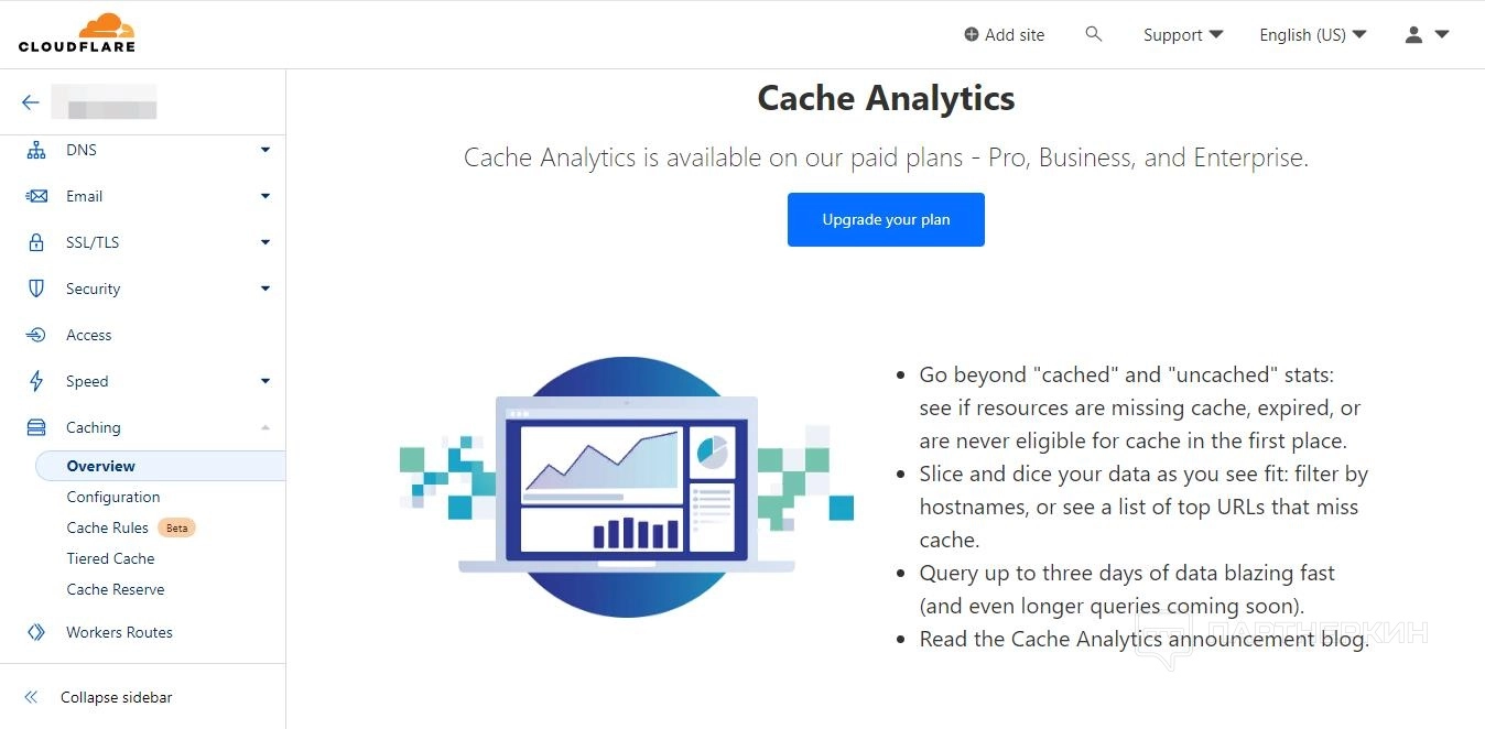 - Caching. Настройка кэша и сохранение временных файлов сайта на серверах Cloudflare.
