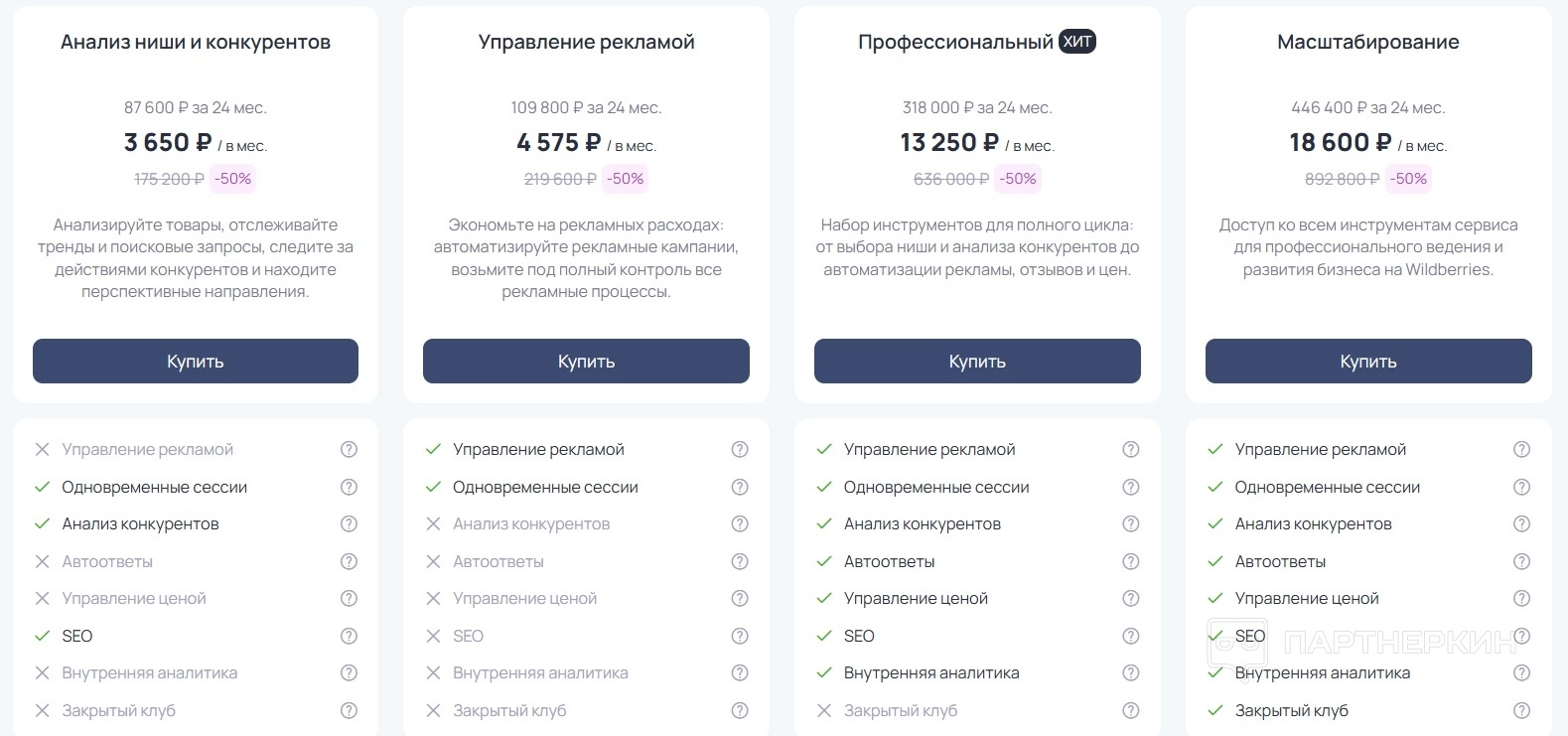 - Профессиональный (хит продаж) — 318 000 ₽ за 24 месяца (13 250 ₽/мес.), 636 000 ₽ (со скидкой 50%). Этот тарифный план предлагает комплексный набор инструментов для полного цикла работы на маркетплейсе: от выбора ниши и анализа конкурентов до автоматизации управления рекламой, отзывами и ценами. Он охватывает ключевые аспекты продвижения и является лучшим выбором для активного роста.
