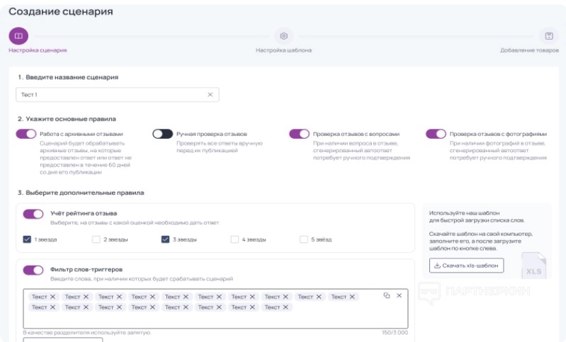 - Настройка ответов по рейтингу . Например, на положительные отзывы можно настроить благодарственные ответы, тогда как для нейтральных или критических отзывов предусмотрены ответы с извинениями и предложениями помощи. Эта гибкость позволяет селлерам сохранять лояльность клиентов и оперативно реагировать на негативные отзывы, предотвращая ухудшение рейтинга.