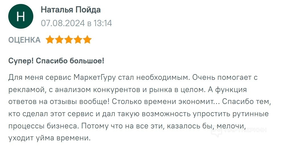 - Умные рекомендации с упоминанием бренда и имени покупателя . MarketGuru позволяет настроить автоматические ответы таким образом, чтобы они выглядели персонализированно и содержали упоминание бренда и имени покупателя. Такая персонализация усиливает ощущение заботы о клиенте и делает отзывы более теплыми и дружелюбными. Умные рекомендации помогают подобрать подходящий тон и содержание для каждого ответа, создавая приятное впечатление у покупателей.