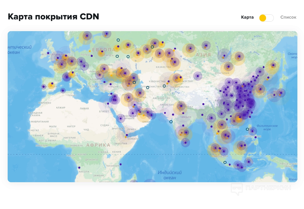 CDNvideo располагает обширной сетью серверов, которые распределены по разным регионам, что позволяет ускорять загрузку сайтов и приложений для пользователей. CDN помогает сократить время задержки, доставляя контент с ближайшего к пользователю сервера. |