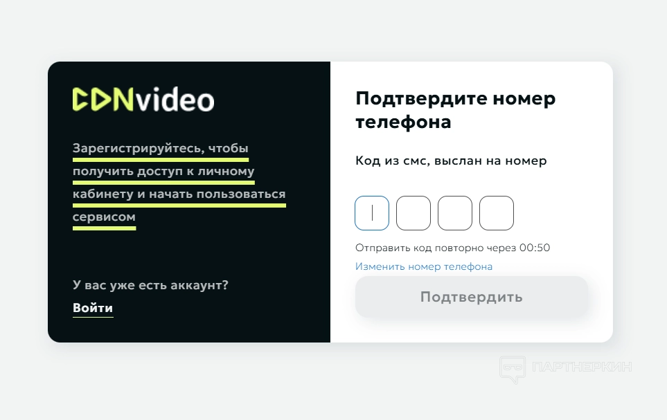 После ввода номера телефона приходит SMS с кодом. Вводим код в соответствующее поле для подтверждения. При необходимости запрашиваем повторную отправку.