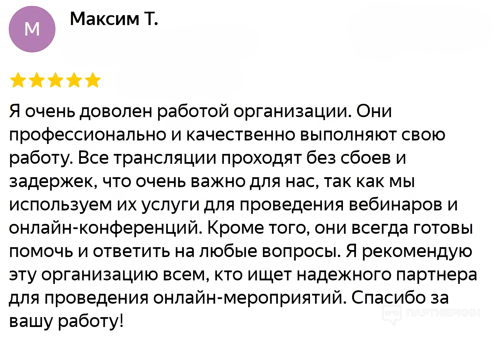 Другой пользователь хвалит надежность сервиса в организации трансляций без задержек, что особенно важно для проведения вебинаров и онлайн-конференций. Он отмечает готовность сотрудников помогать и отвечать на вопросы, рекомендуя платформу как надежного партнера: