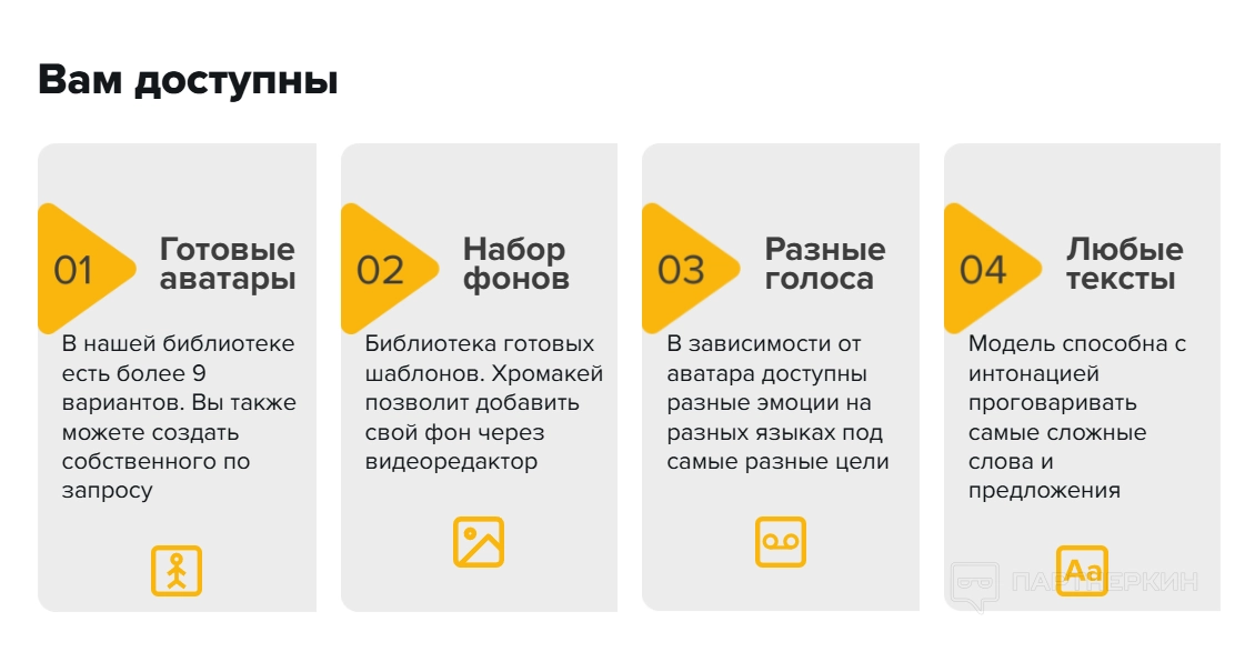 «ИИ Ведущий» предлагает готовые аватары, набор фонов, разные голоса и поддержку любых текстов, что позволяет легко создавать видео с персонализированным ведущим, способным выразительно озвучивать сложные тексты и подстраиваться под нужную атмосферу благодаря разнообразию эмоций и языков.