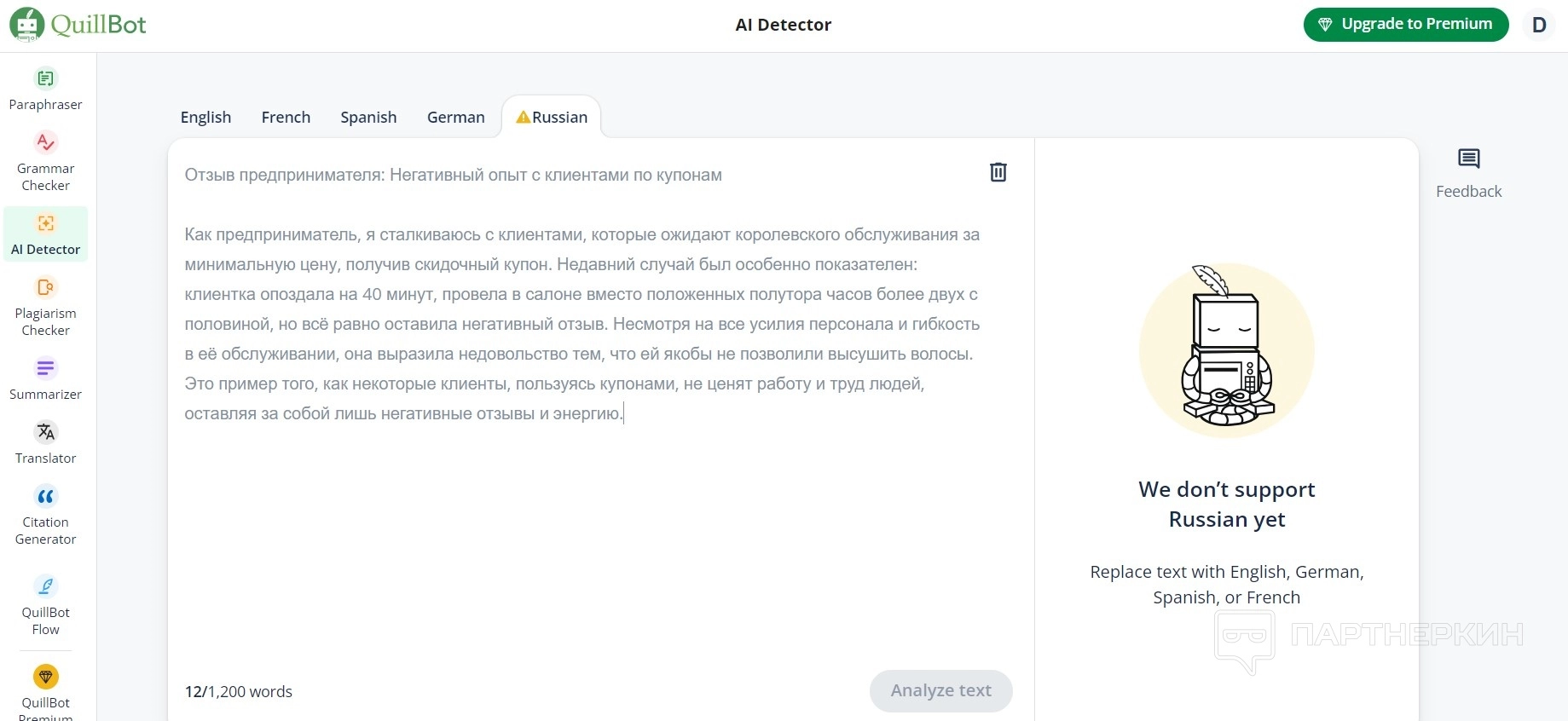 Тестирование началось с того, что мы сгенерировали контент на русском языке и попытались проверить его с помощью AI Detector. Оказалось, что этот инструмент не поддерживает русский язык и не может проанализировать текст.