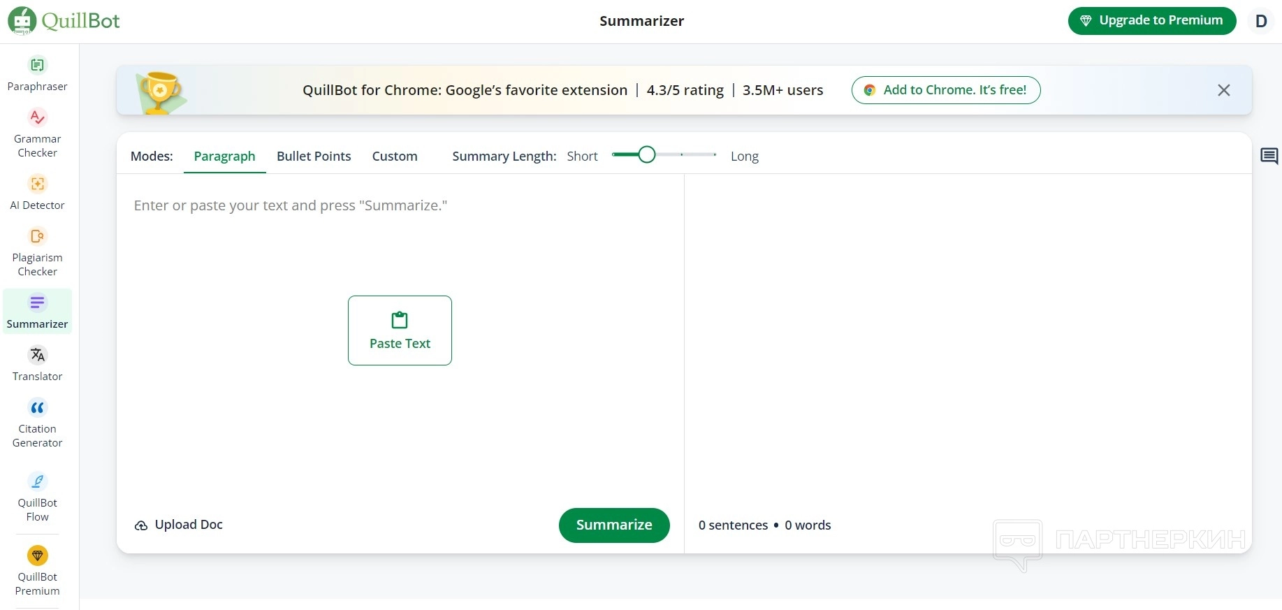 Предназначен для быстрого обобщения длинных текстов и выделения ключевых моментов. Пользователи могут вставить длинный текст, который нужно сократить. Дальше выбрать, как именно резюмировать его — в виде абзаца или набора ключевых предложений. Summarizer использует искусственный интеллект для создания краткого, но информативного резюме, сохраняя при этом все важные моменты исходного текста. Благодаря этому инструменту можно сократить время на чтение длинных статей или документов, получив основную информацию в сжатом виде. Также пользователи могут регулировать длину резюме с помощью специального ползунка, что позволяет получать либо более детализированное, либо более краткое содержание. Инструмент идеален для студентов, исследователей и всех, кто сталкивается с большими объемами информации.