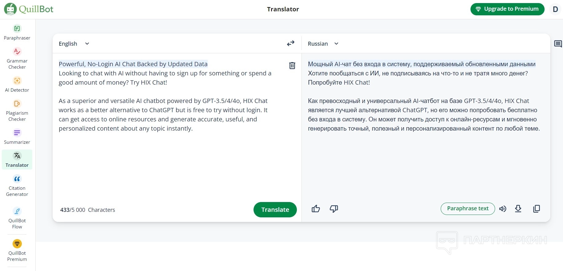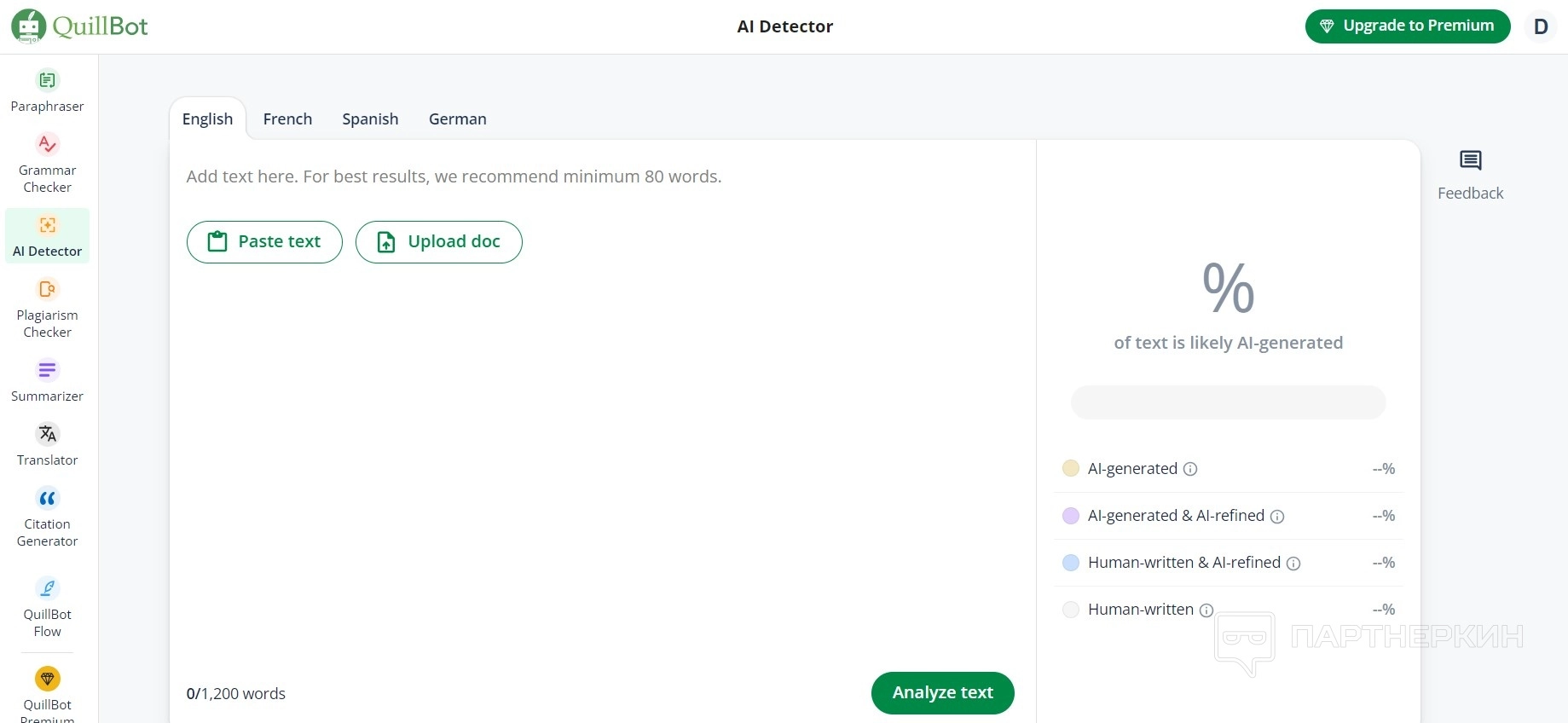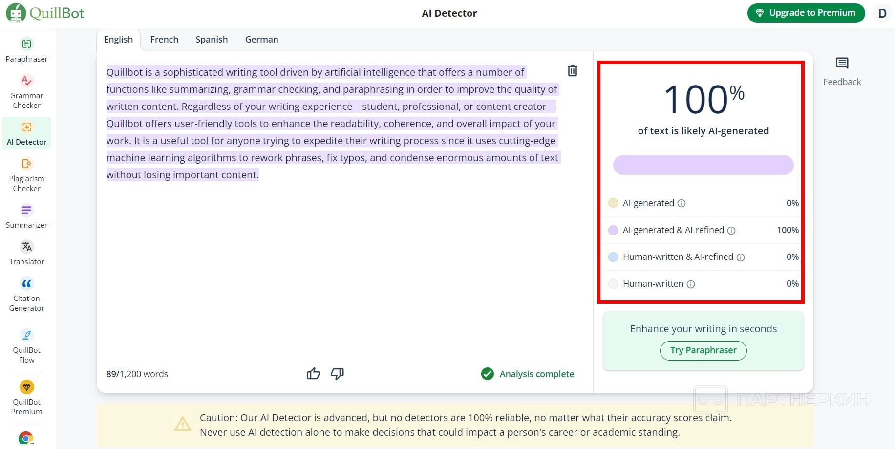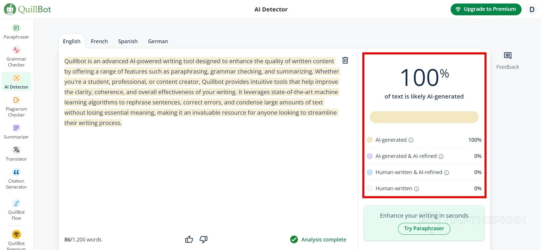 Команда Partnerkin проверила сервис Quillbot, уделив особое внимание инструменту AI Detector. Опция позволяет определить, был ли текст сгенерирован искусственным интеллектом или написан человеком. Однако в ходе тестирования мы выяснили, что Quillbot успешно определяет AI-контент. Однако он не может улучшить текст таким образом, чтобы обойти детекторы ИИ.