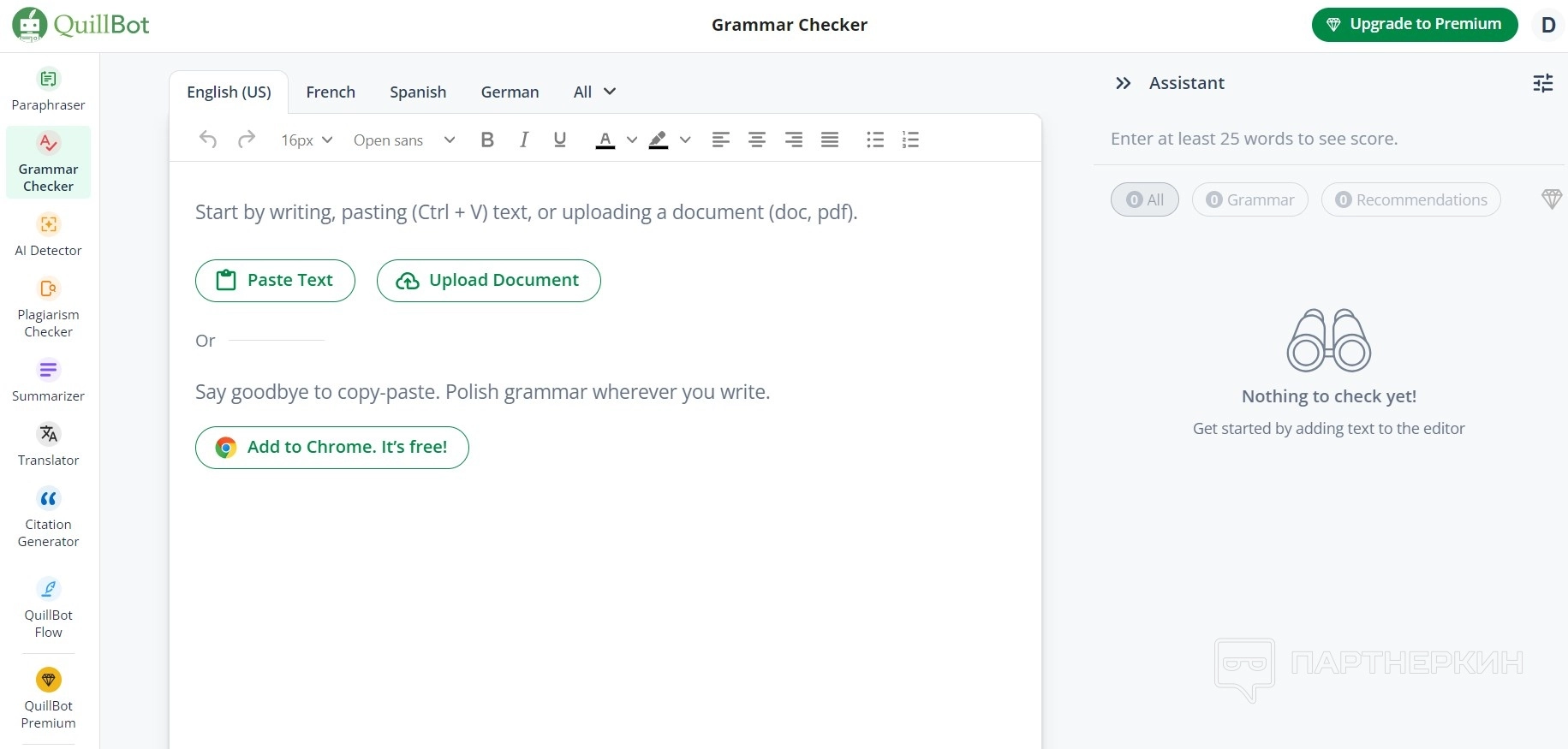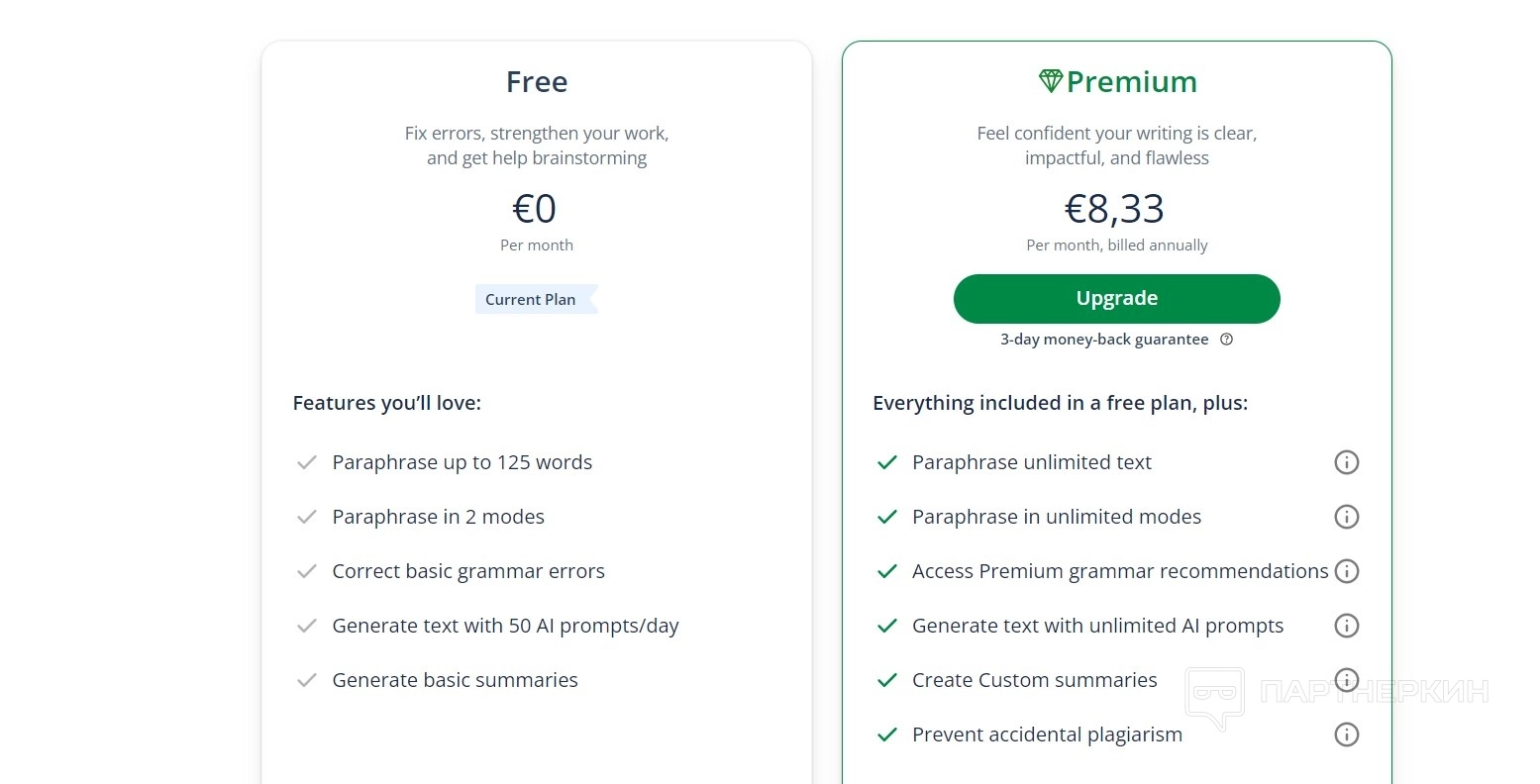 Предлагает более широкий спектр возможностей за €8,33 в месяц при ежегодной оплате. Этот тариф гарантирует, что текст будет четким, впечатляющим и без ошибок. Премиум-подписка включает в себя все функции бесплатного плана, а также следующие услуги: