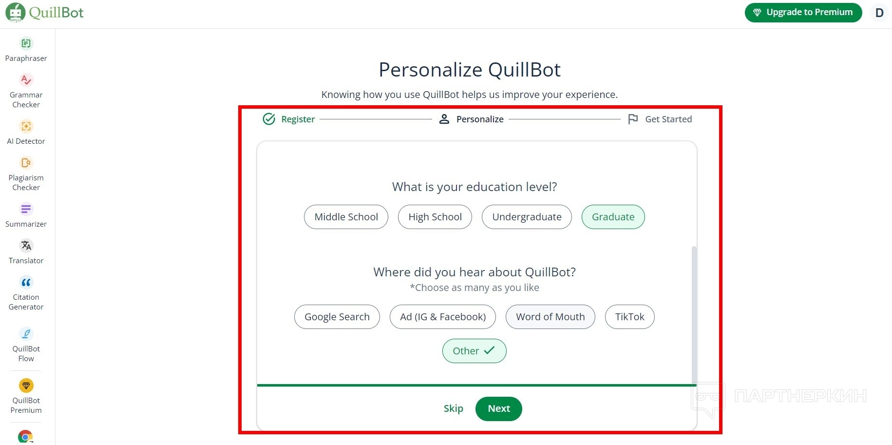 - Настройте ваш аккаунт, ответив на несколько вопросов. Этот шаг можно пропустить.