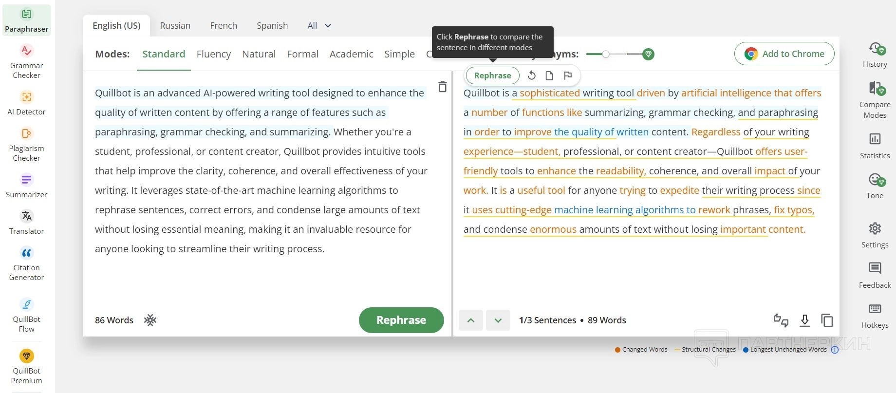 Это инструмент, который помогает перефразировать текст, изменяя его форму. Однако сохраняет исходный смысл. Пользователи могут вставить свой текст в специальное окно и выбрать один из режимов работы. Например, стандартный режим обеспечивает баланс между изменением и сохранением смысла текста. Тогда как творческий режим позволяет значительно изменять текст, создавая более уникальную версию. Дополнительные настройки, такие как ползунок синонимов, позволяют регулировать количество заменяемых слов, а функция «замораживания» предотвращает замену определенных слов, которые не должны быть изменены. Paraphraser также предлагает возможность вручную корректировать синонимы, выбирая наиболее подходящие варианты для каждого слова.