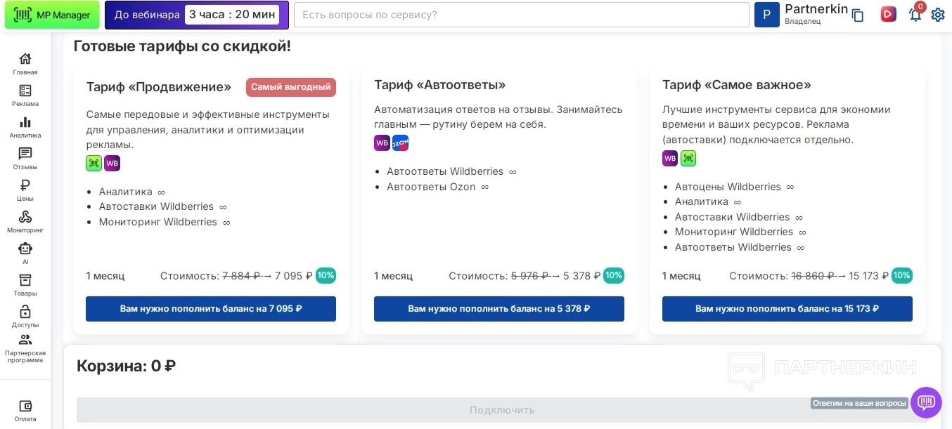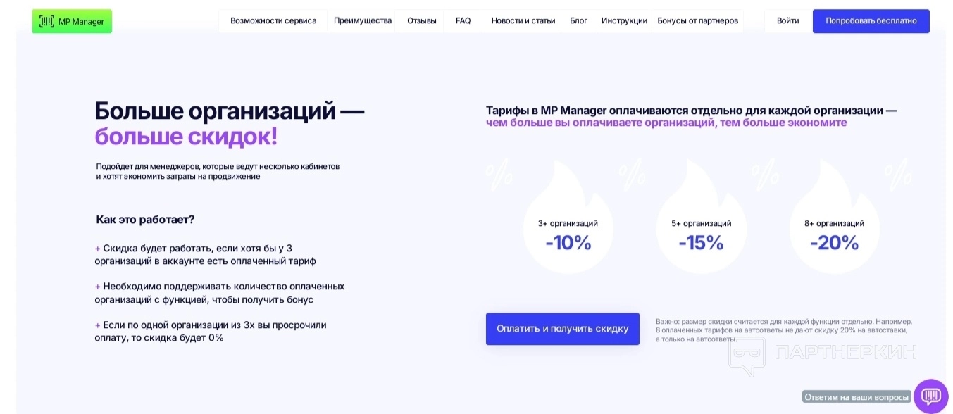 - скидки за ведение организаций — решение разработано для менеджеров, которые отвечают сразу за несколько магазинов на маркетплейсах. Имеются ограничения: скидка применяется только для такого же тарифа (т.е. если приобретаются автоответы, то в дальнейшем полученная скидка распространяется исключительно на них);