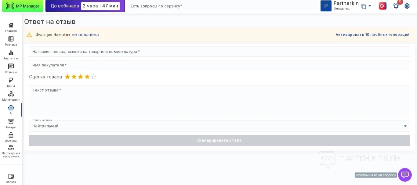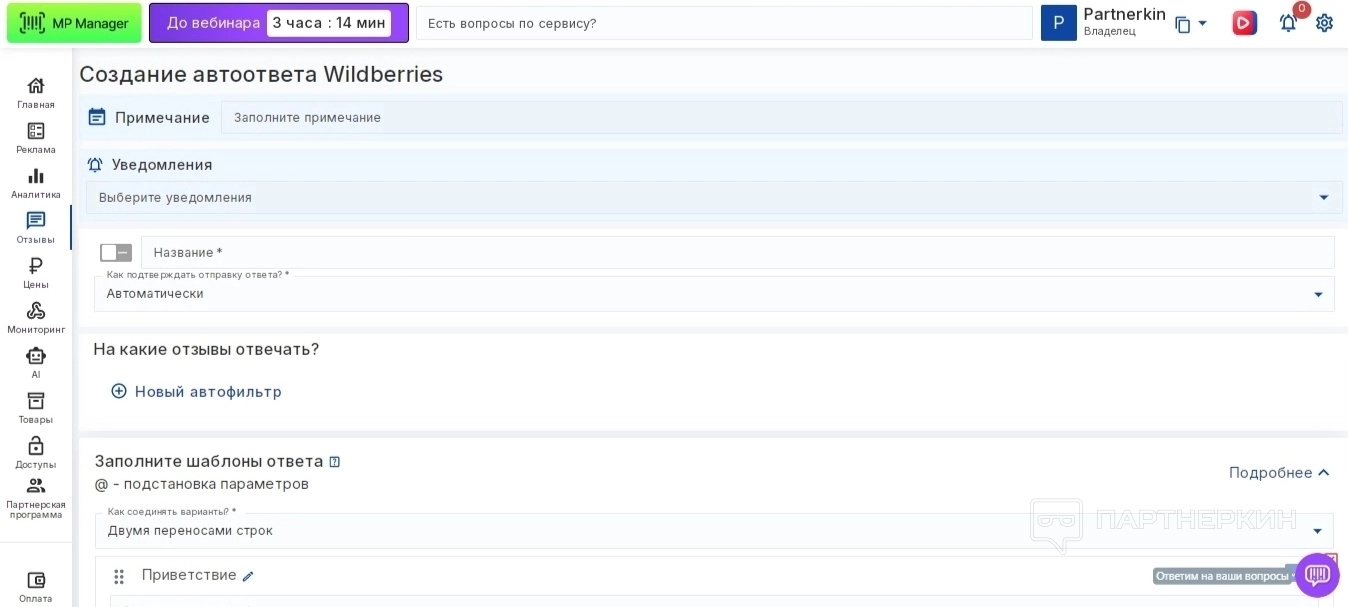 - Автоответы на отзывы . Функция позволяет создать и настроить автоответы для разных типов отзывов на выкупленные товары. Дополнительным плюсом является наличие рекомендаций, подобранных для клиентов алгоритмами.
