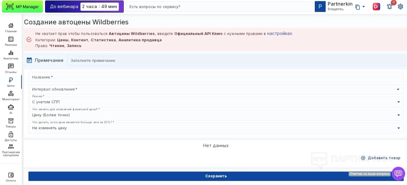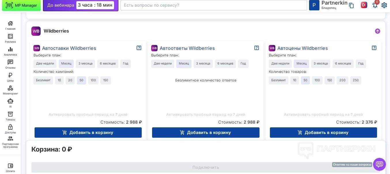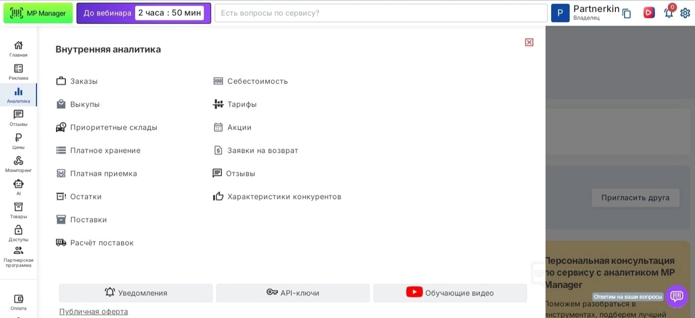 Большинство разделов и инструментов доступны только после подключения кабинета маркетплейса к учетной записи