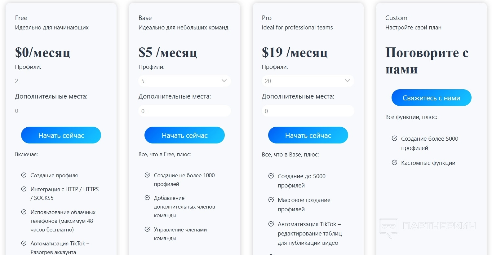 - Бесплатная. Бесплатный тариф включает 2 профиля, создание профиля, интеграцию с HTTP / HTTPS / SOCKS5, 48 часов использования облачных телефонов, опции по автоматизации TikTok.