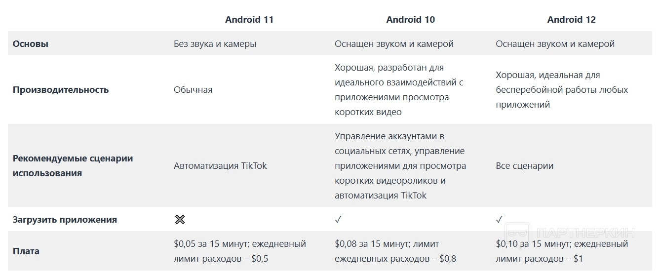 - Android 11 — $0,05 за 15 минут, ежедневный лимит расходов $0,5. Без звука и камеры, обычная производительность, невозможно загружать приложения.