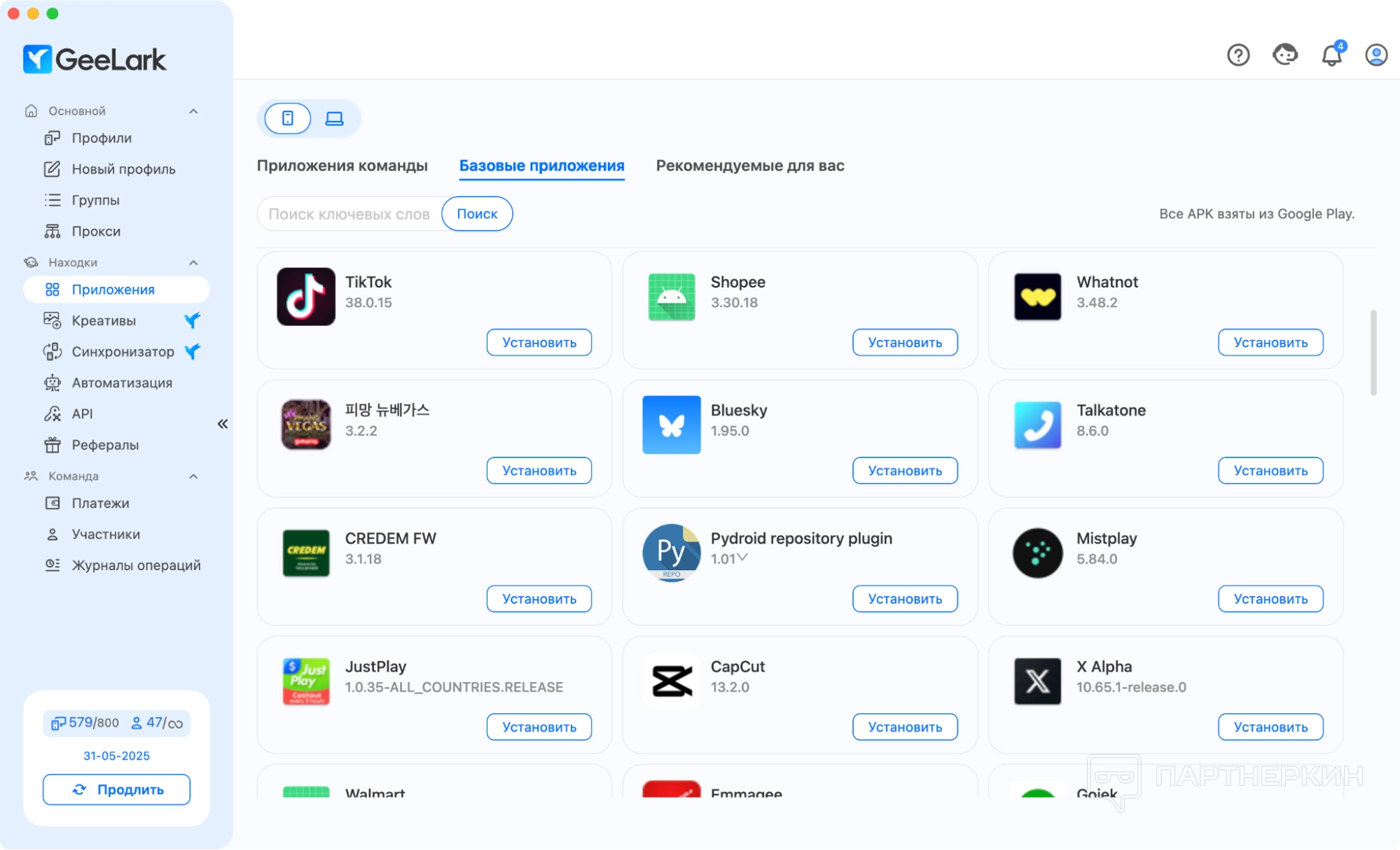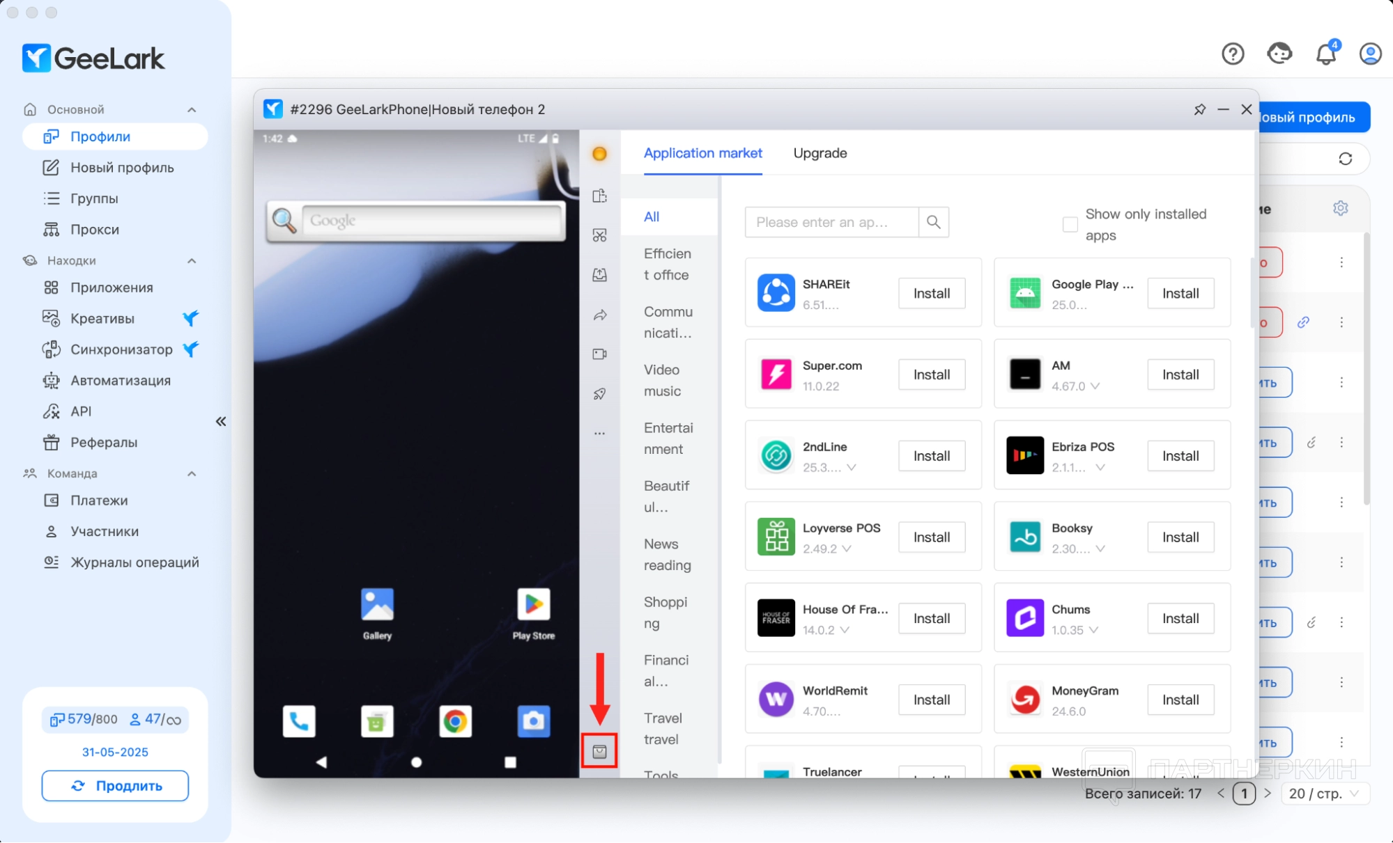 У GeeLark есть встроенный магазин приложений для каждого профиля.