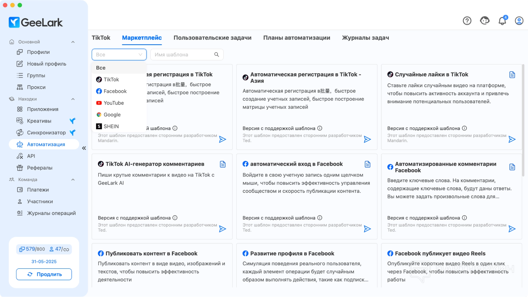 Кроме того, платформа поддерживает шаблоны для работы с другими популярными платформами, такими как Facebook, YouTube и многими другими, которые можно найти в нашем разделе «Маркетплейс». Пользователи также имеют возможность создавать собственные уникальные потоки. Это делает GeeLark универсальным решением для арбитражников, стремящихся к эффективности и гибкости в своей работе.