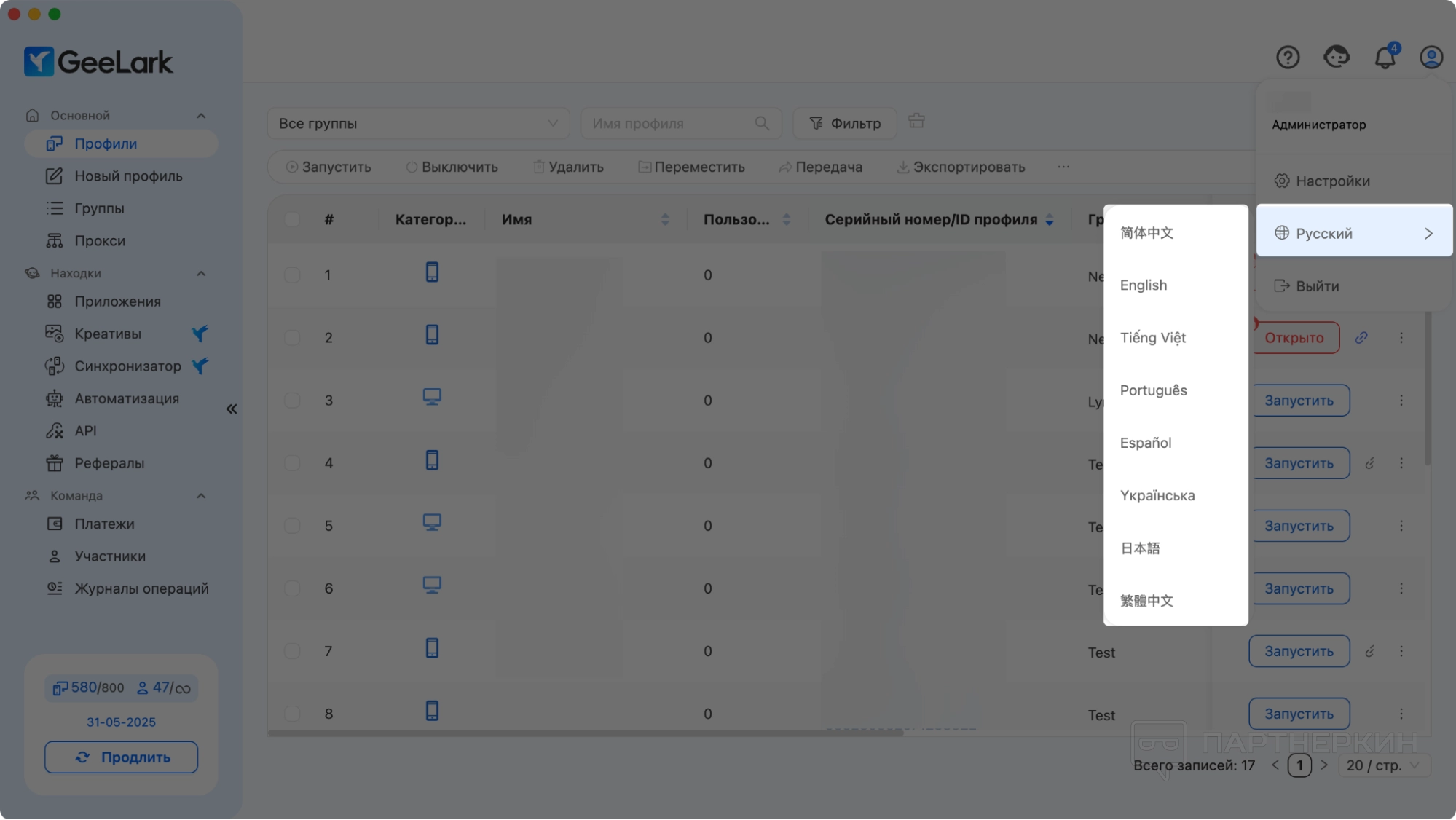 GeeLark доступен на английском, украинском, русском, китайском, японском, вьетнамском, испанском и португальском языках. Разработчики сервиса планируют расширять языковые возможности в будущем.