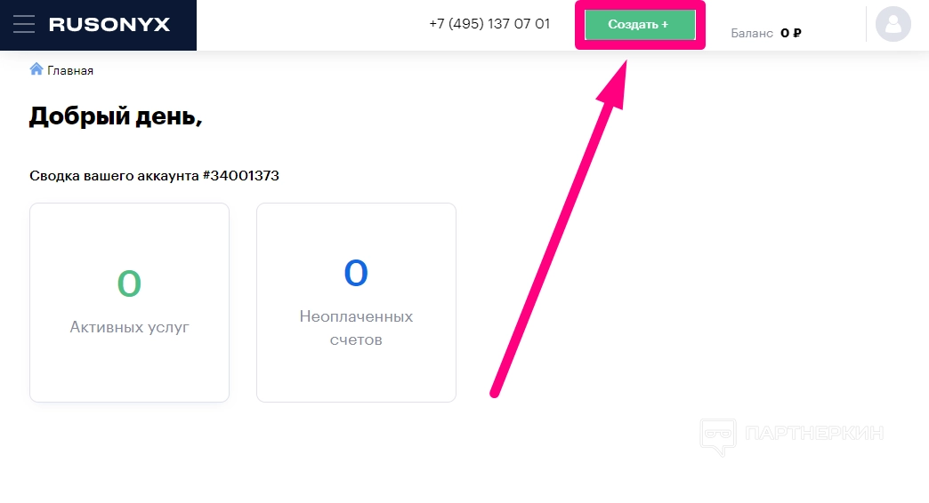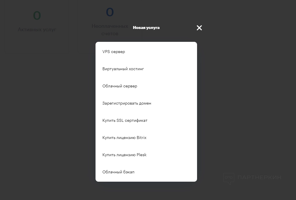 Чтобы добавить новую услугу, нажимаем на кнопку «Создать+», после чего выбираем необходимую услугу из списка: VPS сервер, виртуальный хостинг, облачный сервер или другие доступные опции, такие как регистрация домена или покупка SSL сертификата.