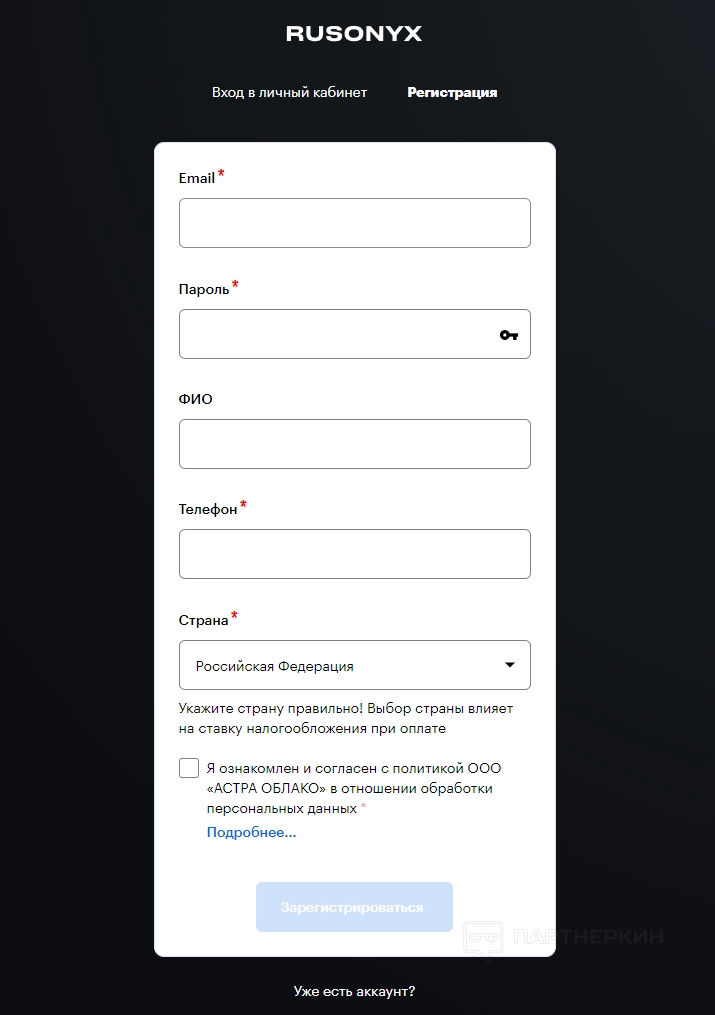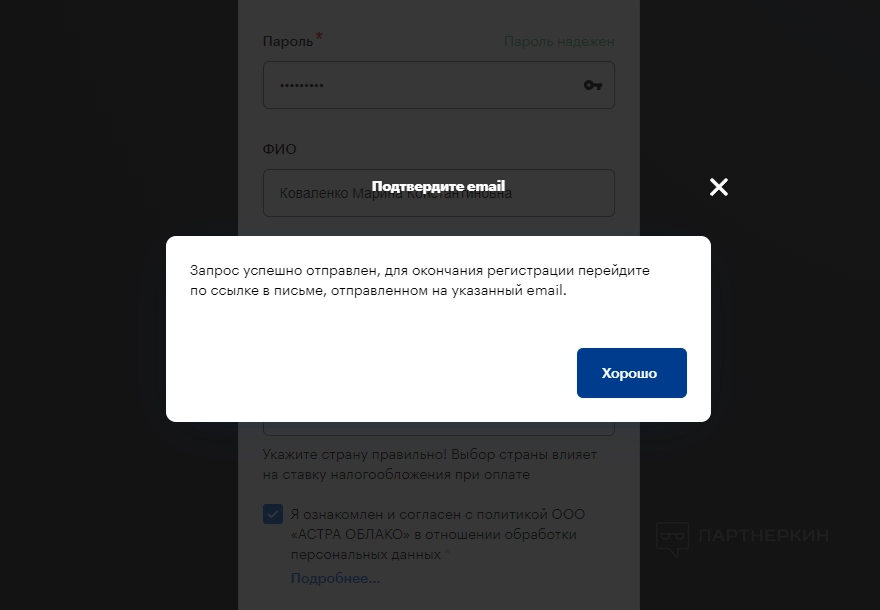Вводим email, придумываем пароль, указываем ФИО и телефон. Выбираем страну и ставим галочку, чтобы согласиться с условиями обработки данных, после чего нажимаем «Зарегистрироваться».
