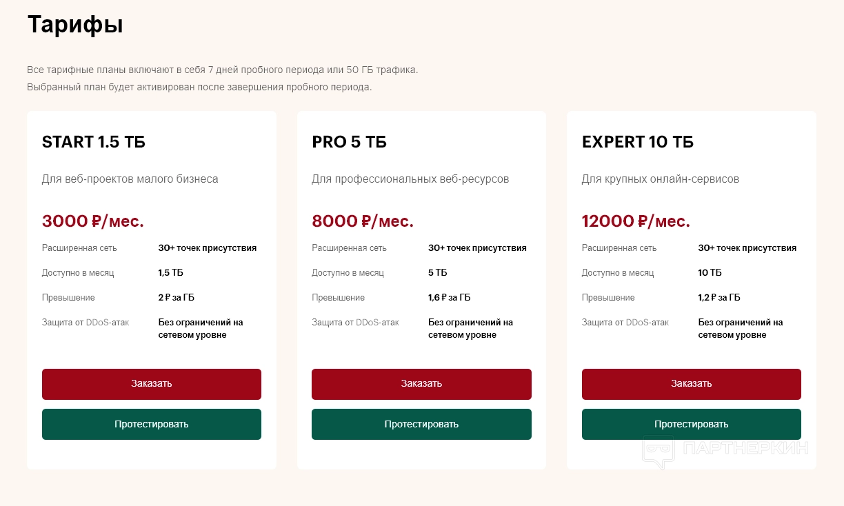 - PRO 5 ТБ — предназначен для профессиональных веб-ресурсов. Тариф стоит 8000 ₽ в месяц и включает 5 ТБ трафика. Стоимость превышения составляет 1,6 ₽ за гигабайт.