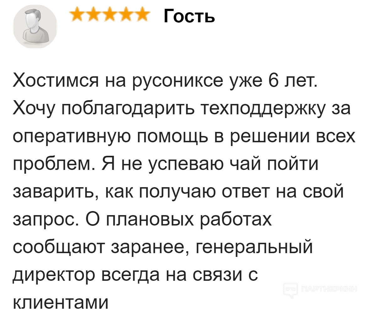 Многие клиенты хостинга довольны скоростью реакции команды на запросы. Один из пользователей, который работает с сервисом уже 6 лет, положительно оценил предварительные уведомления о плановых работах и доступность руководства компании для связи с клиентами: