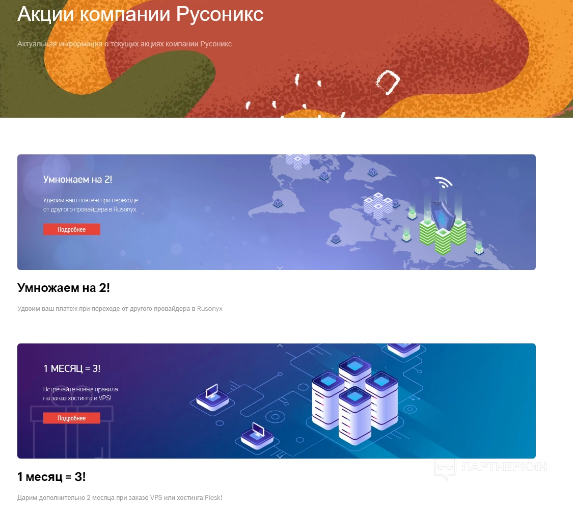 Также Rusonyx предлагает до трех месяцев хостинга бесплатно при переносе сайта от другого провайдера, а для пользователей, работающих с 1С-Битрикс, действует акция: бесплатный VPS на год при покупке лицензии. Вдобавок к этому, при оплате VPS на год можно получить в подарок SSL-сертификат, что значительно повышает безопасность сайта.