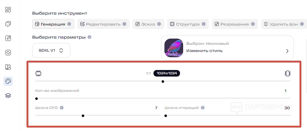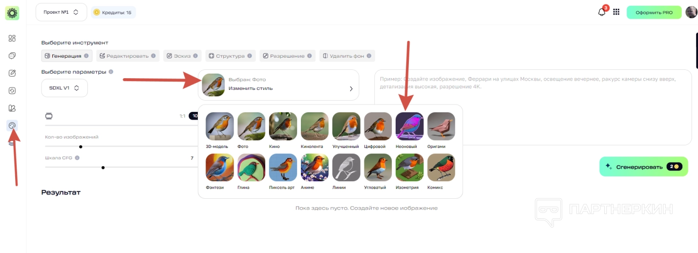 Это инструмент для генерации изображений. Посмотрим, как он функционирует. В верхней части выбираем стиль, например, неон.