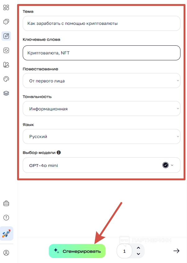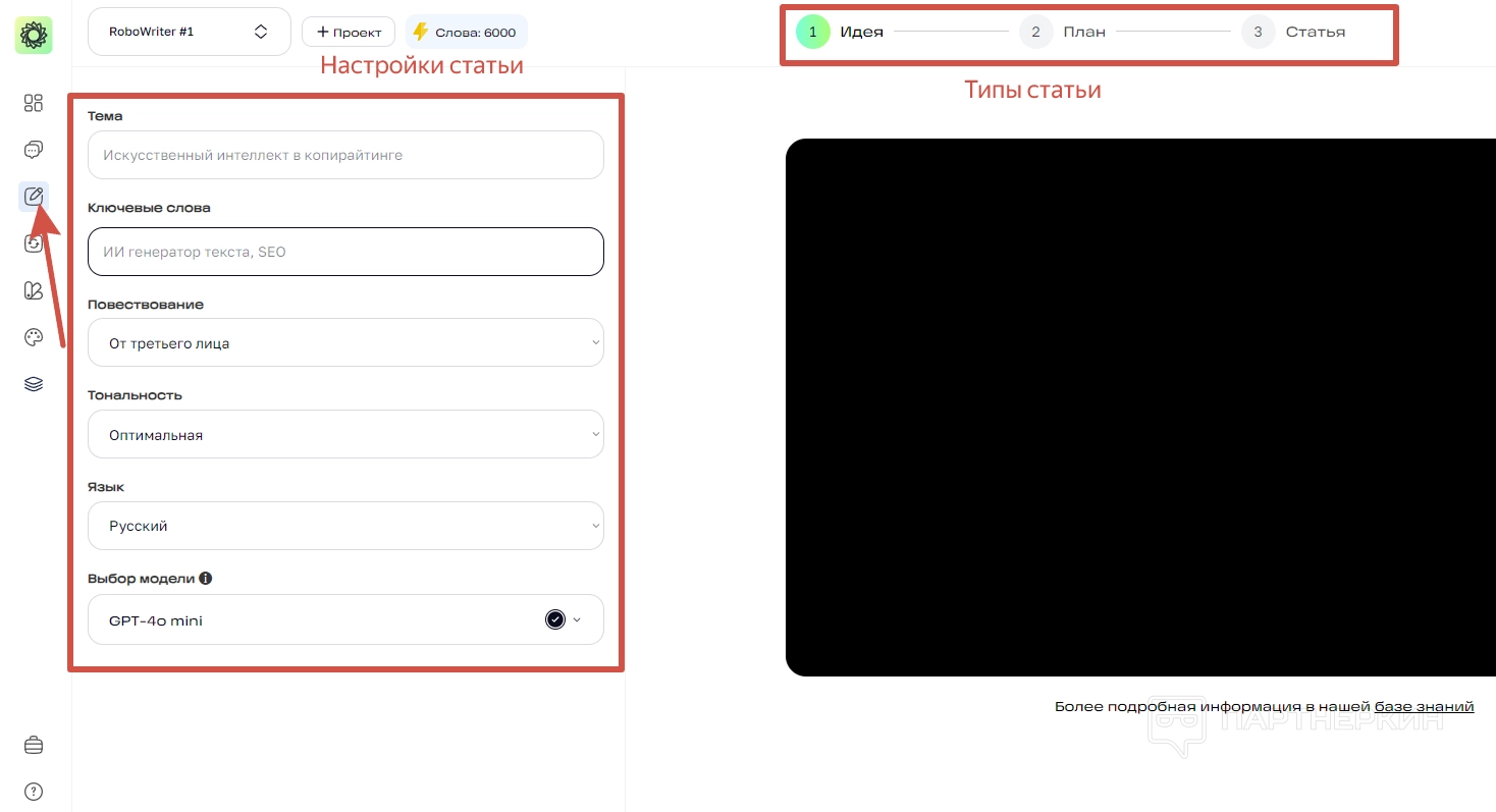 Это генератор статей для блогов. Способен создавать контент объемом до 10 000 символов. В левой части раздела вы найдете панель настроек. Здесь можно задавать разные параметры под статью. Вверху вы можете выбрать тип статьи: