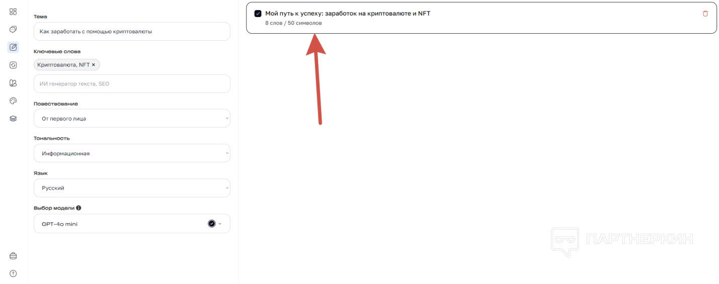 В правой части экрана бот выдает результат. Креативное название для будущей статьи, основанное на заданной теме и ключевых словах. Обратите внимание, что сервис указывает количество слов и символов, которые уже использованы.