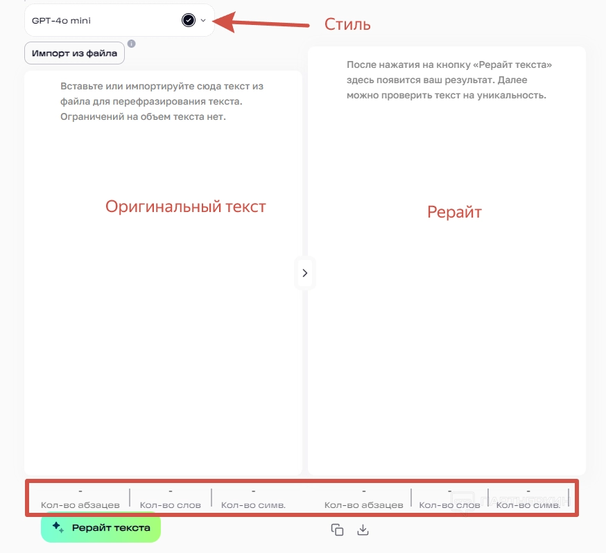 Это инструмент для перефразирования текста. Раздел удобный, разделен на две части. Слева вы указываете оригинальный текст, который должен обработать бот. Справа отобразиться конечный результат. В верхней части вы можете выбрать стиль. В нижней будет отображено количество слов, абзацев и символов по обоим текстам.