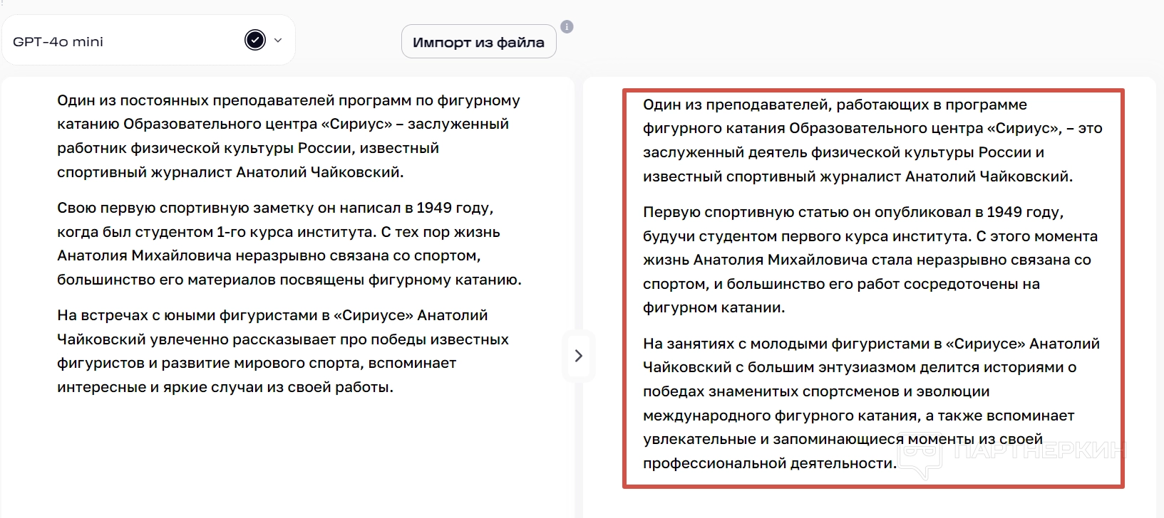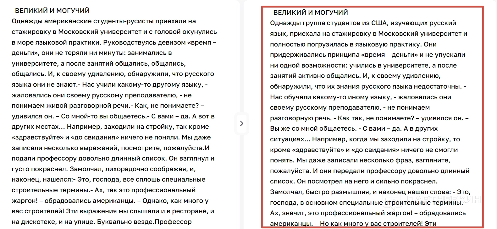 Результат оказался таким же, как и с новостной заметкой. Структура не изменена, большинство слов просто заменены синонимами. Вывод – снова поверхностный рерайт.