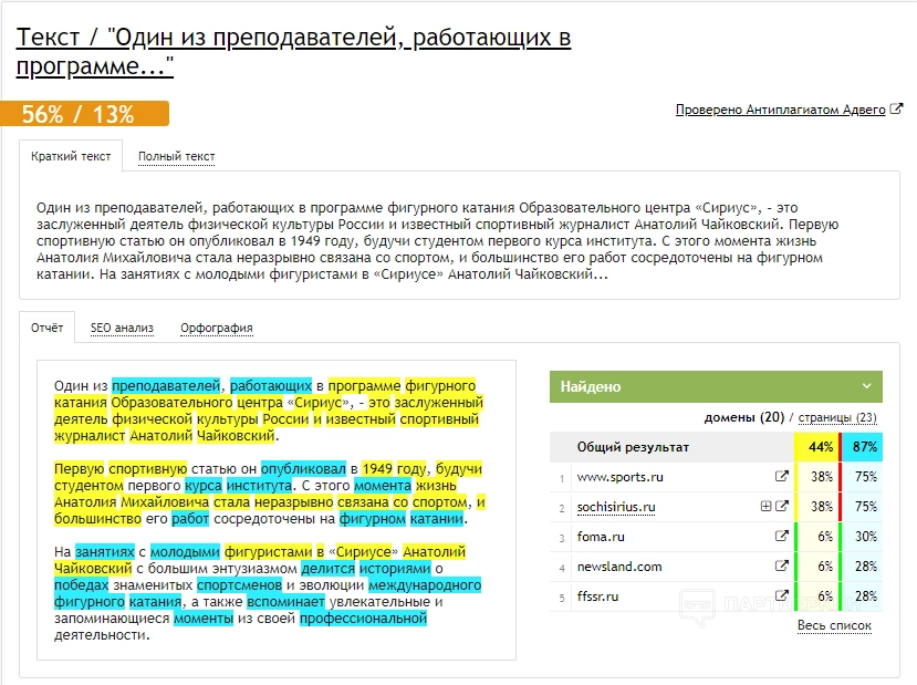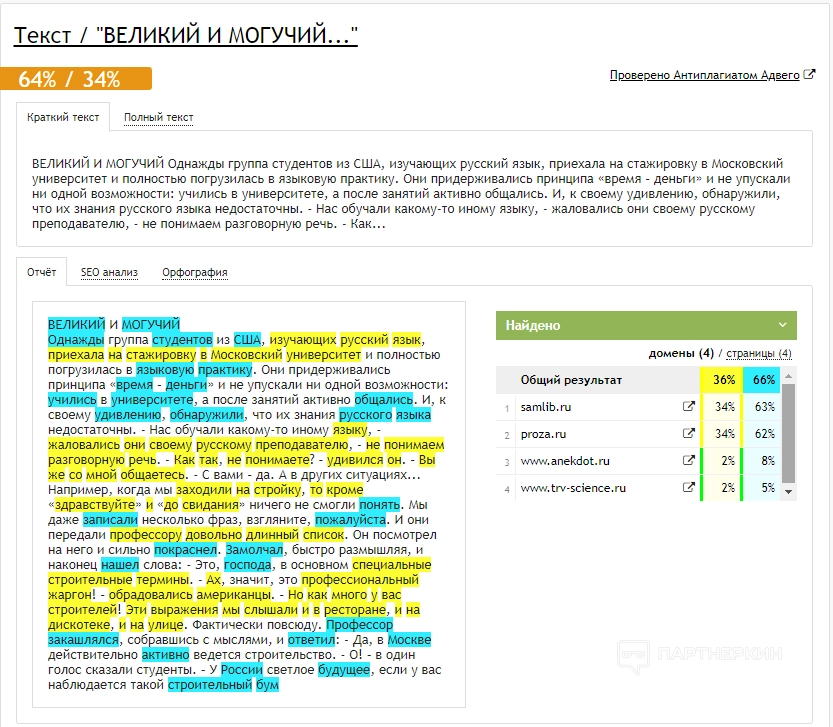 Результат по уникальности здесь лучше, но не настолько, чтобы назвать хорошим. Сайт с первоисточником стоит по совпадениям на втором месте (proza.ru). Те же проблемы – большое количество повторяющихся слов, и все из-за того, что сервис элементарно не изменил структуру.