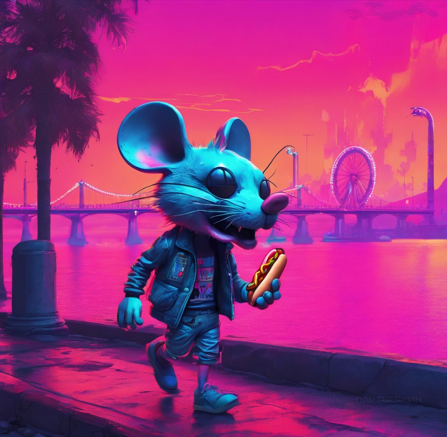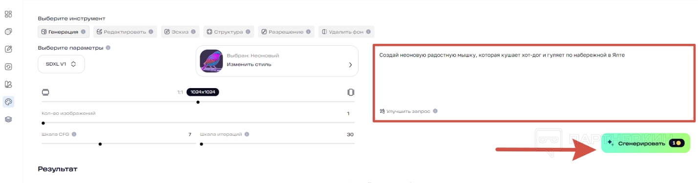 В описании вписываем «Создай неоновую радостную мышку, которая кушает хот-дог и гуляет по набережной в Ялте». Жмем на «Сгенерировать» и ждем результата.
