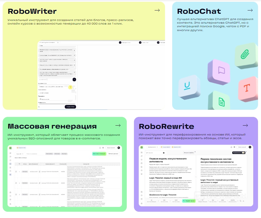 Также стоит отметить, персонализированного чат-бота RoboChat, который может адаптироваться под конкретные запросы и задачи. Кроме того, функция массовой генерации контента значительно ускоряет создание однотипных материалов, а RoboArt позволяет буквально за секунды получать уникальные цифровые произведения. Более 100 AI-шаблонов помогают сразу приступать к работе, предоставляя готовые решения для разных ситуаций