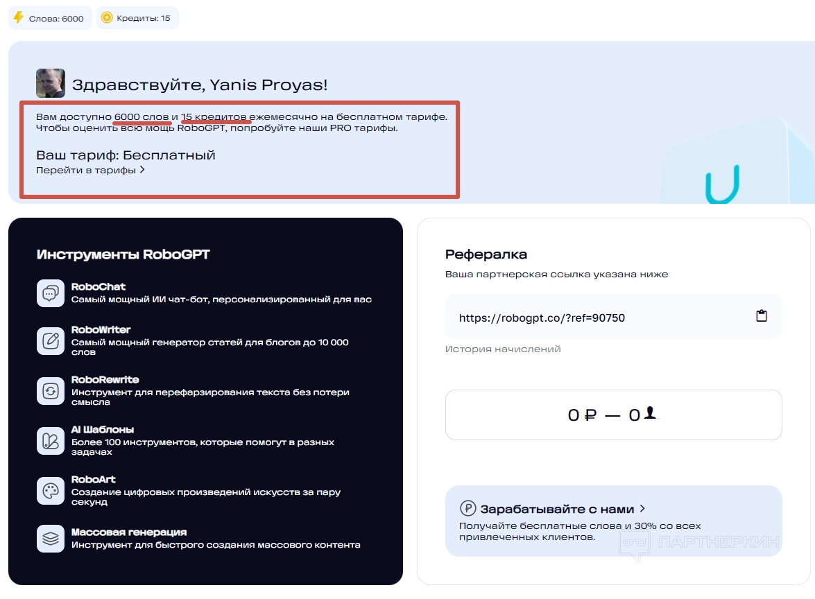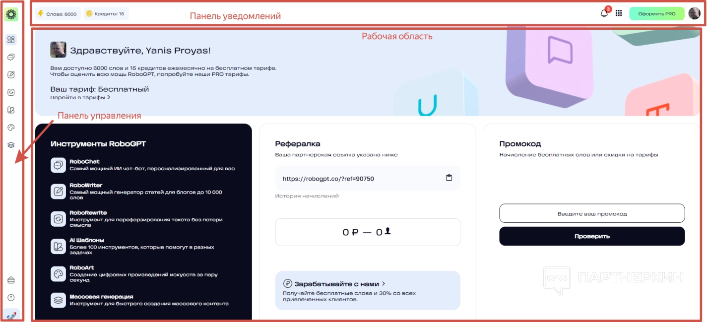 - Панель управления – перечень необходимых инструментов, а также доступ к партнерской программе, базе знаний и платным тарифам.
