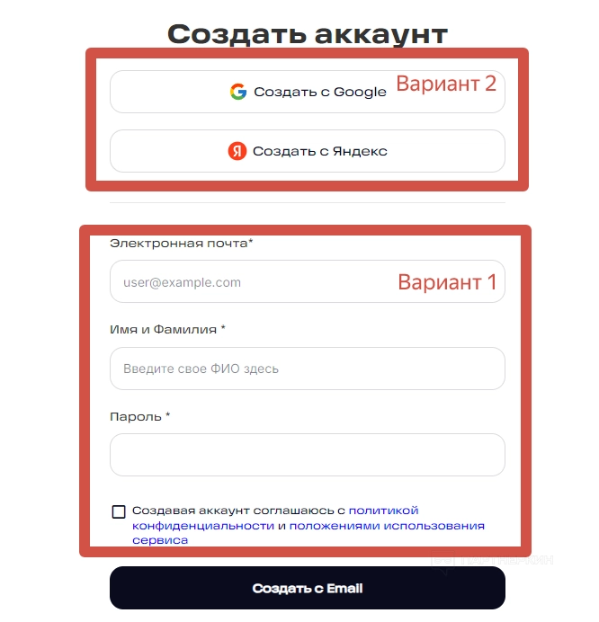 Далее откроется форма, где нужно указать электронную почту, имя, фамилию и пароль. Если вы не хотите вручную вводить данные, можно авторизоваться с помощью аккаунтов Google или Яндекс.