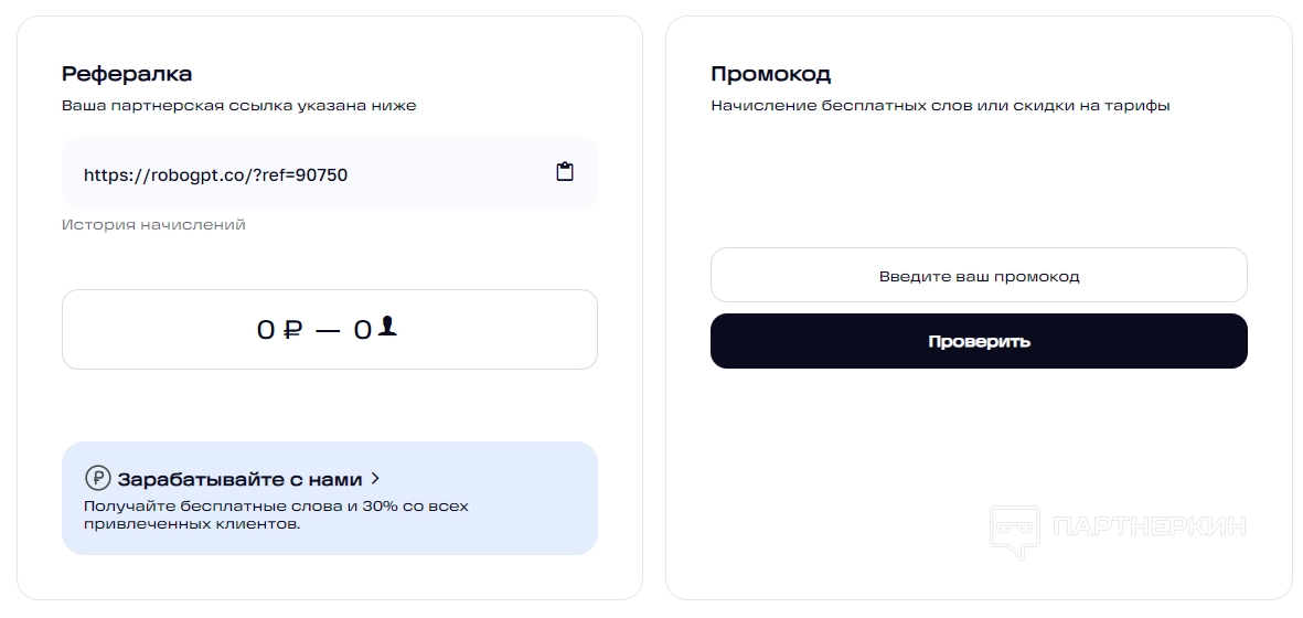 Ниже отображаются доступные инструменты. По факту это дублирование разделов из панели управления. Справа сводная информация по партнерской программе: ваша реферальная ссылка, история начислений, URL на детальное описание партнерки. Рядом вы найдете строку, в которой можно указать промокод (если у вас он есть).