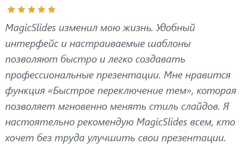 Этот отзыв демонстрирует высокую оценку функциональности сервиса и его способности значительно облегчить процесс создания профессиональных презентаций. Пользователю нравится, что сервис помогает повысить качество презентаций без затруднений.